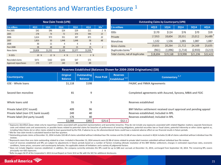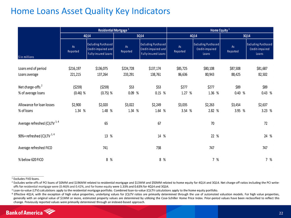 Representations and Warranties Exposure 1 21 ____________________ 1 Exposures identified above relate only to repurchase claims associated with purported representations and warranties breaches. They do not include any exposures associated with related litigation matters; separate foreclosure costs and related costs and assessments; or possible losses related to potential claims for breaches of performance of servicing obligations, potential securities law or fraud claims, potential indemnity or other claims against us, including False Claims Act or other claims related to loans guaranteed by the FHA. If adverse to us, the aforementioned items could have a material adverse effect on our financial results in future periods. 2 Mix for new claim trends is calculated based on last four quarters. 3 Outstanding private claims at December 31, 2014 includes $10.4B of claims submitted without individual loan file reviews and the $1.6B of new claims received in 4Q14 includes $1.4B of claims submitted without individual loan file reviews. 4 Represents more than one claim outstanding related to a loan. Included in December 31, 2014 amounts were $2.9B of claims related to private label investors submitted without individual loan file reviews. 5 Level of reserves established and RPL are subject to adjustments in future periods based on a number of factors including ultimate resolution of the BNY Mellon settlement, changes in estimated repurchase rates, economic conditions, home prices, consumer and counterparty behavior, the applicable statute of limitations and a variety of judgmental factors. 6 Does not include litigation reserves established. In addition, the company currently estimates the RPL could be up to $4B over accruals at December 31, 2014, unchanged from September 30, 2014. The remaining RPL covers principally non-GSE exposures. 7 Refer to pages 54-57 of the Corporation’s 2013 Annual Report on Form 10-K on file with the SEC for additional disclosures. $ in millions 4Q13 1Q14 2Q14 3Q14 4Q14 GSEs $170 $124 $76 $70 $59 Private 17,953 18,604 20,551 23,012 24,489 Monolines 1,532 1,536 1,085 1,087 1,087 Gross claims 19,655 20,264 21,712 24,169 25,635 Duplicate claims 4 (961) (1,096) (1,714) (2,933) (3,213) Total claims, net of duplicates $18,694 $19,168 $19,998 $21,236 $22,422 Outstanding Claims by Counterparty (UPB) $ in millions 4Q13 1Q14 2Q14 Pre 2005 $42 $96 $24 $29 $11 2 % 2005 278 74 72 374 594 15 2006 1,614 973 351 307 871 33 2007 1,826 50 1,948 1,648 58 48 2008 30 11 4 4 6 - Post 2008 38 48 39 15 19 2 New claims $3,828 $1,252 $2,438 $2,377 $1,559 % GSEs 10 % 12 % 4 % 3 % 3 % Rescinded claims $471 $162 $255 $47 $71 Approved repurchases 270 177 240 88 89 New Claim Trends (UPB) Mix 2 3Q14 4Q14 Counterparty Original Balance Outstanding Balance Have Paid Reserves Established 5, 6 Commentary 5, 7 GSE - Whole loans $1,118 $198 FHLMC and FNMA Agreements Second-lien monoline 81 9 Completed agreements with Assured, Syncora, MBIA and FGIC Whole loa s sold 55 9 Reserves established Private label (CFC issued) 409 96 BNY Mellon settlement received court approval and pending appeal Private l bel (non CFC bank issued) 249 40 Reserves established; Included in RPL Private label (3rd party issued) 176 40 Reserves established; Included in RPL $2,088 $392 $25.6 $12.1 Reserves Established (Balances Shown for 2004-2008 Originations) ($B) 3 3