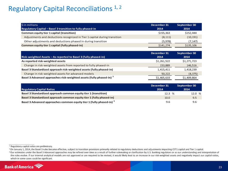 ____________________ 1 Regulatory capital ratios are preliminary. 2 On January 1, 2014, the Basel 3 rules became effective, subject to transition provisions primarily related to regulatory deductions and adjustments impacting CET1 capital and Tier 1 capital. 3 Our estimates under the Basel 3 Advanced approaches may be refined over time as a result of further rulemaking or clarification by U.S. banking regulators or as our understanding and interpretation of the rules evolve. If our internal analytical models are not approved or are required to be revised, it would likely lead to an increase in our risk-weighted assets and negatively impact our capital ratios, which in some cases could be significant. $ in millions Regulatory Capital – Basel 3 transition to fully phased-in Common equity tier 1 capital (transition) $155,363 $152,444 Adjustments and deductions recognized in Tier 1 capital during transition (8,111) (10,191) Other adjustments and deductions phased in during transition (5,978) (7,147) Common equity tier 1 capital (fully phased-in) $141,274 $135,106 Risk-weighted Assets – As reported to Basel 3 (fully phased-in) As reported risk-weighted assets $1,261,522 $1,271,723 Change in risk-weighted assets from reported to fully phased-in 153,889 146,516 Basel 3 Standardized approach risk-weighted assets (fully phased-in) 1,415,411 1,418,239 Change in risk-weighted assets for advanced models 50,222 (8,375) Basel 3 Advanced approaches risk-weighted assets (fully phased-in) 3 $1,465,633 $1,409,864 Regulatory Capital Ratios Basel 3 Standardized approach common equity tier 1 (transition) 12.3 % 12.0 % Basel 3 Standardized approach common equity tier 1 (fully phased-in) 10.0 9.5 Basel 3 Advanced approaches common equity tier 1 (fully phased-in) 3 9.6 9.6 December 31 2014 December 31 2014 December 31 2014 September 30 2014 September 30 2014 September 30 2014 23 Regulatory Capital Reconciliations 1, 2