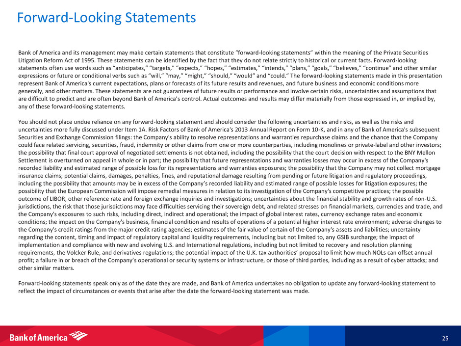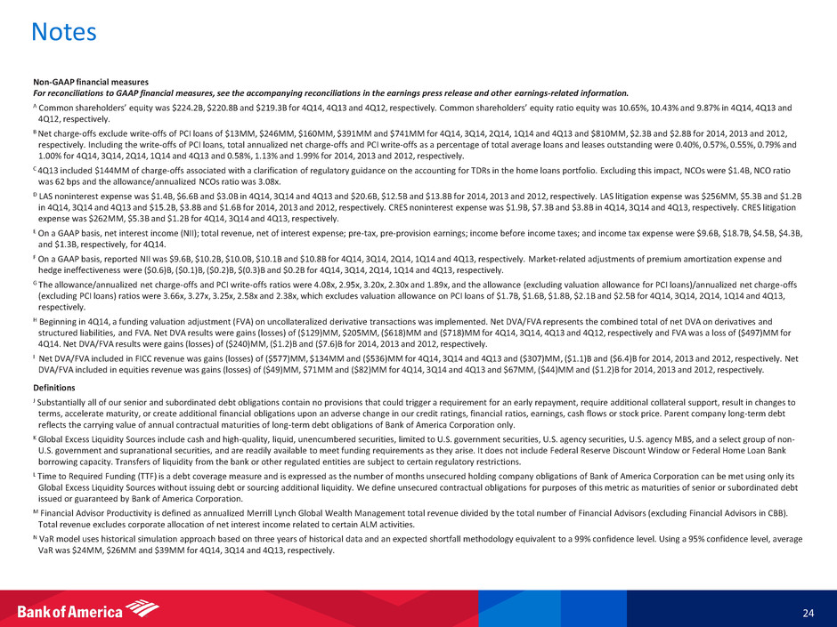 Notes 24 Non-GAAP financial measures For reconciliations to GAAP financial measures, see the accompanying reconciliations in the earnings press release and other earnings-related information. A Common shareholders’ equity was $224.2B, $220.8B and $219.3B for 4Q14, 4Q13 and 4Q12, respectively. Common shareholders’ equity ratio equity was 10.65%, 10.43% and 9.87% in 4Q14, 4Q13 and 4Q12, respectively. B Net charge-offs exclude write-offs of PCI loans of $13MM, $246MM, $160MM, $391MM and $741MM for 4Q14, 3Q14, 2Q14, 1Q14 and 4Q13 and $810MM, $2.3B and $2.8B for 2014, 2013 and 2012, respectively. Including the write-offs of PCI loans, total annualized net charge-offs and PCI write-offs as a percentage of total average loans and leases outstanding were 0.40%, 0.57%, 0.55%, 0.79% and 1.00% for 4Q14, 3Q14, 2Q14, 1Q14 and 4Q13 and 0.58%, 1.13% and 1.99% for 2014, 2013 and 2012, respectively. C 4Q13 included $144MM of charge-offs associated with a clarification of regulatory guidance on the accounting for TDRs in the home loans portfolio. Excluding this impact, NCOs were $1.4B, NCO ratio was 62 bps and the allowance/annualized NCOs ratio was 3.08x. D LAS noninterest expense was $1.4B, $6.6B and $3.0B in 4Q14, 3Q14 and 4Q13 and $20.6B, $12.5B and $13.8B for 2014, 2013 and 2012, respectively. LAS litigation expense was $256MM, $5.3B and $1.2B in 4Q14, 3Q14 and 4Q13 and $15.2B, $3.8B and $1.6B for 2014, 2013 and 2012, respectively. CRES noninterest expense was $1.9B, $7.3B and $3.8B in 4Q14, 3Q14 and 4Q13, respectively. CRES litigation expense was $262MM, $5.3B and $1.2B for 4Q14, 3Q14 and 4Q13, respectively. E On a GAAP basis, net interest income (NII); total revenue, net of interest expense; pre-tax, pre-provision earnings; income before income taxes; and income tax expense were $9.6B, $18.7B, $4.5B, $4.3B, and $1.3B, respectively, for 4Q14. F On a GAAP basis, reported NII was $9.6B, $10.2B, $10.0B, $10.1B and $10.8B for 4Q14, 3Q14, 2Q14, 1Q14 and 4Q13, respectively. Market-related adjustments of premium amortization expense and hedge ineffectiveness were ($0.6)B, ($0.1)B, ($0.2)B, $(0.3)B and $0.2B for 4Q14, 3Q14, 2Q14, 1Q14 and 4Q13, respectively. G The allowance/annualized net charge-offs and PCI write-offs ratios were 4.08x, 2.95x, 3.20x, 2.30x and 1.89x, and the allowance (excluding valuation allowance for PCI loans)/annualized net charge-offs (excluding PCI loans) ratios were 3.66x, 3.27x, 3.25x, 2.58x and 2.38x, which excludes valuation allowance on PCI loans of $1.7B, $1.6B, $1.8B, $2.1B and $2.5B for 4Q14, 3Q14, 2Q14, 1Q14 and 4Q13, respectively. H Beginning in 4Q14, a funding valuation adjustment (FVA) on uncollateralized derivative transactions was implemented. Net DVA/FVA represents the combined total of net DVA on derivatives and structured liabilities, and FVA. Net DVA results were gains (losses) of ($129)MM, $205MM, ($618)MM and ($718)MM for 4Q14, 3Q14, 4Q13 and 4Q12, respectively and FVA was a loss of ($497)MM for 4Q14. Net DVA/FVA results were gains (losses) of ($240)MM, ($1.2)B and ($7.6)B for 2014, 2013 and 2012, respectively. I Net DVA/FVA included in FICC revenue was gains (losses) of ($577)MM, $134MM and ($536)MM for 4Q14, 3Q14 and 4Q13 and ($307)MM, ($1.1)B and ($6.4)B for 2014, 2013 and 2012, respectively. Net DVA/FVA included in equities revenue was gains (losses) of ($49)MM, $71MM and ($82)MM for 4Q14, 3Q14 and 4Q13 and $67MM, ($44)MM and ($1.2)B for 2014, 2013 and 2012, respectively. Definitions J Substantially all of our senior and subordinated debt obligations contain no provisions that could trigger a requirement for an early repayment, require additional collateral support, result in changes to terms, accelerate maturity, or create additional financial obligations upon an adverse change in our credit ratings, financial ratios, earnings, cash flows or stock price. Parent company long-term debt reflects the carrying value of annual contractual maturities of long-term debt obligations of Bank of America Corporation only. K Global Excess Liquidity Sources include cash and high-quality, liquid, unencumbered securities, limited to U.S. government securities, U.S. agency securities, U.S. agency MBS, and a select group of non- U.S. government and supranational securities, and are readily available to meet funding requirements as they arise. It does not include Federal Reserve Discount Window or Federal Home Loan Bank borrowing capacity. Transfers of liquidity from the bank or other regulated entities are subject to certain regulatory restrictions. L Time to Required Funding (TTF) is a debt coverage measure and is expressed as the number of months unsecured holding company obligations of Bank of America Corporation can be met using only its Global Excess Liquidity Sources without issuing debt or sourcing additional liquidity. We define unsecured contractual obligations for purposes of this metric as maturities of senior or subordinated debt issued or guaranteed by Bank of America Corporation. M Financial Advisor Productivity is defined as annualized Merrill Lynch Global Wealth Management total revenue divided by the total number of Financial Advisors (excluding Financial Advisors in CBB). Total revenue excludes corporate allocation of net interest income related to certain ALM activities. N VaR model uses historical simulation approach based on three years of historical data and an expected shortfall methodology equivalent to a 99% confidence level. Using a 95% confidence level, average VaR was $24MM, $26MM and $39MM for 4Q14, 3Q14 and 4Q13, respectively.