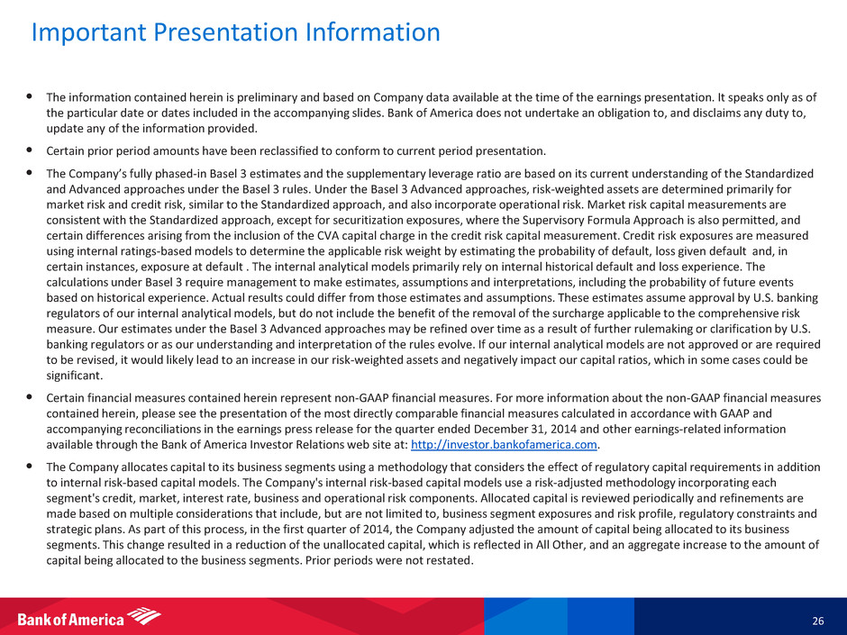Forward-Looking Statements 25 Bank of America and its management may make certain statements that constitute “forward-looking statements” within the meaning of the Private Securities Litigation Reform Act of 1995. These statements can be identified by the fact that they do not relate strictly to historical or current facts. Forward-looking statements often use words such as “anticipates,” “targets,” “expects,” “hopes,” “estimates,” “intends,” “plans,” “goals,” “believes,” “continue” and other similar expressions or future or conditional verbs such as “will,” “may,” “might,” “should,” “would” and “could.” The forward-looking statements made in this presentation represent Bank of America's current expectations, plans or forecasts of its future results and revenues, and future business and economic conditions more generally, and other matters. These statements are not guarantees of future results or performance and involve certain risks, uncertainties and assumptions that are difficult to predict and are often beyond Bank of America’s control. Actual outcomes and results may differ materially from those expressed in, or implied by, any of these forward-looking statements. You should not place undue reliance on any forward-looking statement and should consider the following uncertainties and risks, as well as the risks and uncertainties more fully discussed under Item 1A. Risk Factors of Bank of America's 2013 Annual Report on Form 10-K, and in any of Bank of America's subsequent Securities and Exchange Commission filings: the Company's ability to resolve representations and warranties repurchase claims and the chance that the Company could face related servicing, securities, fraud, indemnity or other claims from one or more counterparties, including monolines or private-label and other investors; the possibility that final court approval of negotiated settlements is not obtained, including the possibility that the court decision with respect to the BNY Mellon Settlement is overturned on appeal in whole or in part; the possibility that future representations and warranties losses may occur in excess of the Company's recorded liability and estimated range of possible loss for its representations and warranties exposures; the possibility that the Company may not collect mortgage insurance claims; potential claims, damages, penalties, fines, and reputational damage resulting from pending or future litigation and regulatory proceedings, including the possibility that amounts may be in excess of the Company’s recorded liability and estimated range of possible losses for litigation exposures; the possibility that the European Commission will impose remedial measures in relation to its investigation of the Company's competitive practices; the possible outcome of LIBOR, other reference rate and foreign exchange inquiries and investigations; uncertainties about the financial stability and growth rates of non-U.S. jurisdictions, the risk that those jurisdictions may face difficulties servicing their sovereign debt, and related stresses on financial markets, currencies and trade, and the Company's exposures to such risks, including direct, indirect and operational; the impact of global interest rates, currency exchange rates and economic conditions; the impact on the Company's business, financial condition and results of operations of a potential higher interest rate environment; adverse changes to the Company's credit ratings from the major credit rating agencies; estimates of the fair value of certain of the Company's assets and liabilities; uncertainty regarding the content, timing and impact of regulatory capital and liquidity requirements, including but not limited to, any GSIB surcharge; the impact of implementation and compliance with new and evolving U.S. and International regulations, including but not limited to recovery and resolution planning requirements, the Volcker Rule, and derivatives regulations; the potential impact of the U.K. tax authorities’ proposal to limit how much NOLs can offset annual profit; a failure in or breach of the Company’s operational or security systems or infrastructure, or those of third parties, including as a result of cyber attacks; and other similar matters. Forward-looking statements speak only as of the date they are made, and Bank of America undertakes no obligation to update any forward-looking statement to reflect the impact of circumstances or events that arise after the date the forward-looking statement was made.