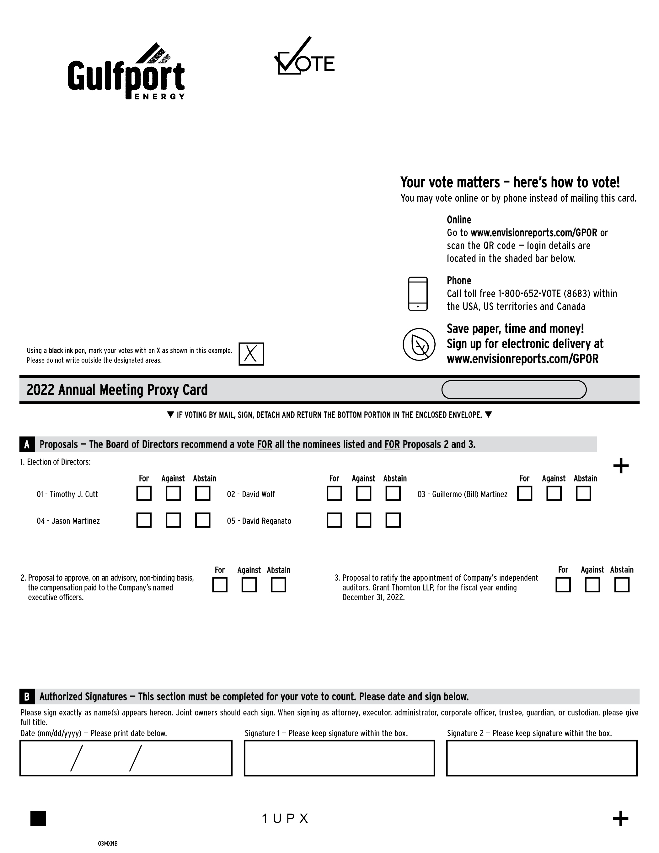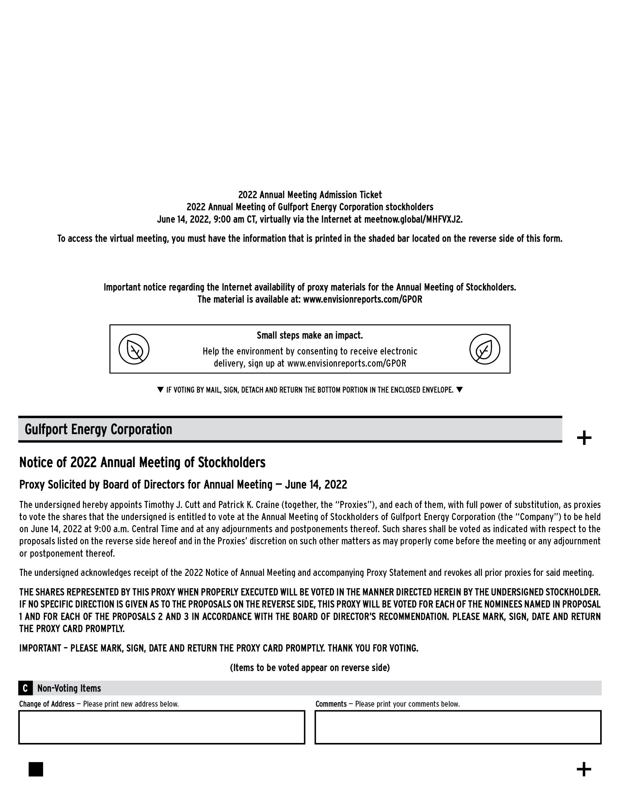 2022 Annual Meeting Admission Ticket 2022 Annual Meeting of Gulfport Energy Corporation stockholders June 14, 2022, 9:00 am CT, virtually via the Internet at meetnow.global/MHFVXJ2. To access the virtual meeting, you must have the information that is printed in the shaded bar located on the reverse side of this form. Important notice regarding the Internet availability of proxy materials for the Annual Meeting of Stockholders. The material is available at: www.envisionreports.com/GPOR Small steps make an impact. Help the environment by consenting to receive electronic delivery, sign up at www.envisionreports.com/GPOR IF VOTING BY MAIL, SIGN, DETACH AND RETURN THE BOTTOM PORTION IN THE ENCLOSED ENVELOPE. Gulfport Energy Corporation Notice of 2022 Annual Meeting of Stockholders Proxy Solicited by Board of Directors for Annual Meeting — June 14, 2022 The undersigned hereby appoints Timothy J. Cutt and Patrick K. Craine (together, the “Proxies”), and each of them, with full power of substitution, as proxies to vote the shares that the undersigned is entitled to vote at the Annual Meeting of Stockholders of Gulfport Energy Corporation (the “Company”) to be held on June 14, 2022 at 9:00 a.m. Central Time and at any adjournments and postponements thereof. Such shares shall be voted as indicated with respect to the proposals listed on the reverse side hereof and in the Proxies’ discretion on such other matters as may properly come before the meeting or any adjournment or postponement thereof. The undersigned acknowledges receipt of the 2022 Notice of Annual Meeting and accompanying Proxy Statement and revokes all prior proxies for said meeting. THE SHARES REPRESENTED BY THIS PROXY WHEN PROPERLY EXECUTED WILL BE VOTED IN THE MANNER DIRECTED HEREIN BY THE UNDERSIGNED STOCKHOLDER. IF NO SPECIFIC DIRECTION IS GIVEN AS TO THE PROPOSALS ON THE REVERSE SIDE, THIS PROXY WILL BE VOTED FOR EACH OF THE NOMINEES NAMED IN PROPOSAL 1 AND FOR EACH OF THE PROPOSALS 2 AND 3 IN ACCORDANCE WITH THE BOARD OF DIRECTOR’S RECOMMENDATION. PLEASE MARK, SIGN, DATE AND RETURN THE PROXY CARD PROMPTLY. IMPORTANT – PLEASE MARK, SIGN, DATE AND RETURN THE PROXY CARD PROMPTLY. THANK YOU FOR VOTING. (Items to be voted appear on reverse side) C Non-Voting Items Change of Address — Please print new address below. Comments — Please print your comments below.