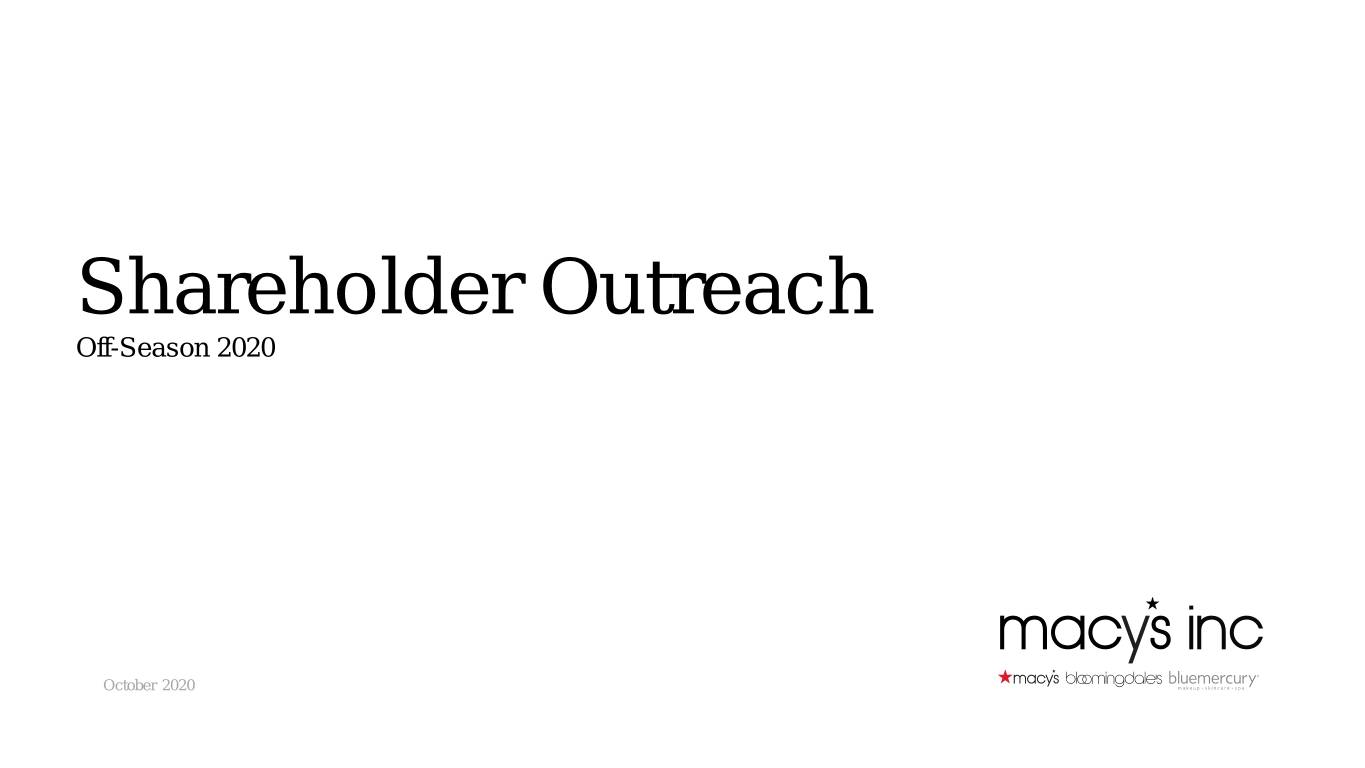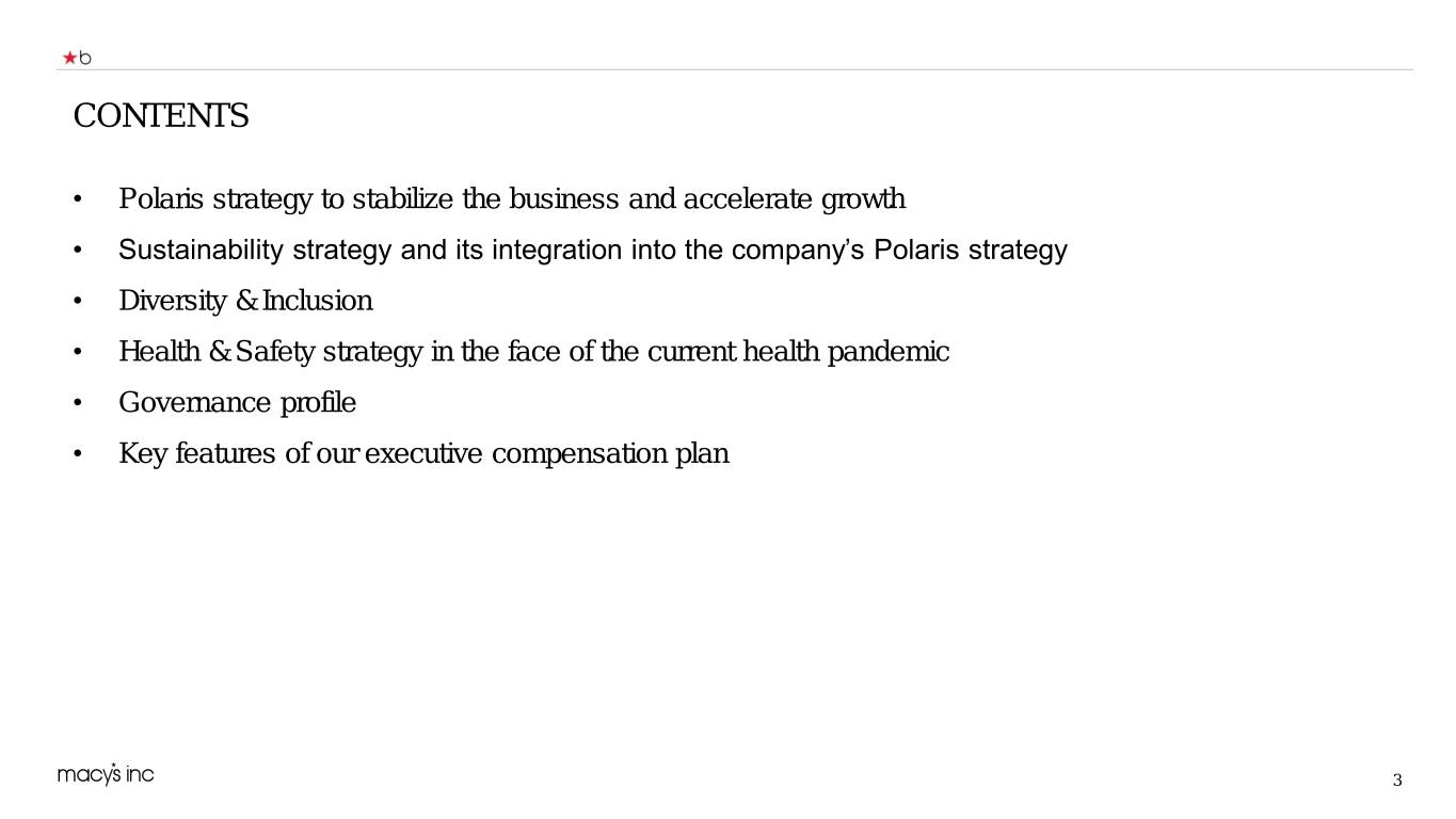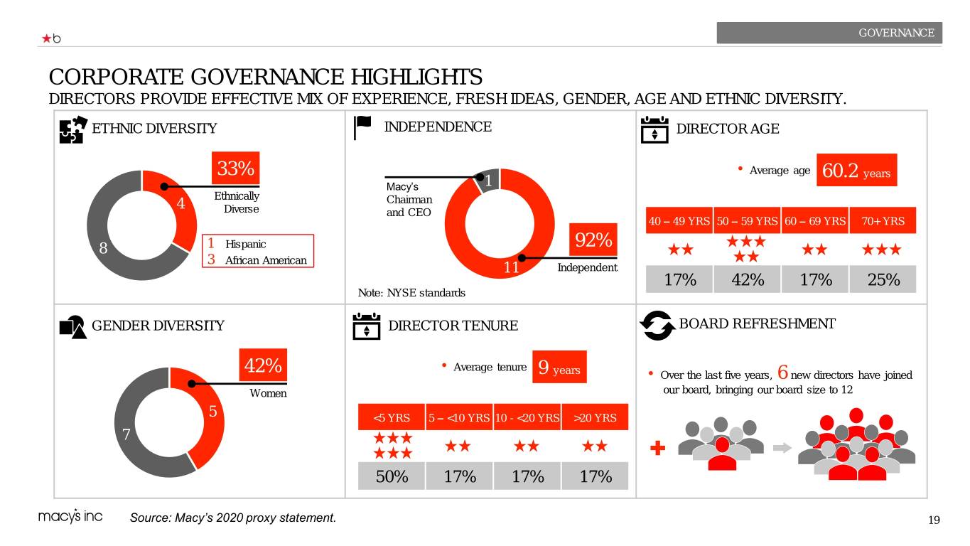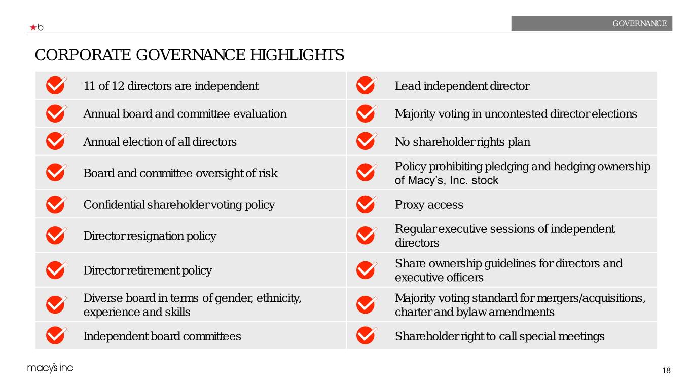 GOVERNANCE CORPORATE GOVERNANCE HIGHLIGHTS 11 of 12 directors are independent Lead independent director Annual board and committee evaluation Majority voting in uncontested director elections Annual election of all directors No shareholder rights plan Policy prohibiting pledging and hedging ownership Board and committee oversight of risk of Macy’s, Inc. stock Confidential shareholder voting policy Proxy access Regular executive sessions of independent Director resignation policy directors Share ownership guidelines for directors and Director retirement policy executive officers Diverse board in terms of gender, ethnicity, Majority voting standard for mergers/acquisitions, experience and skills charter and bylaw amendments Independent board committees Shareholder right to call special meetings 18