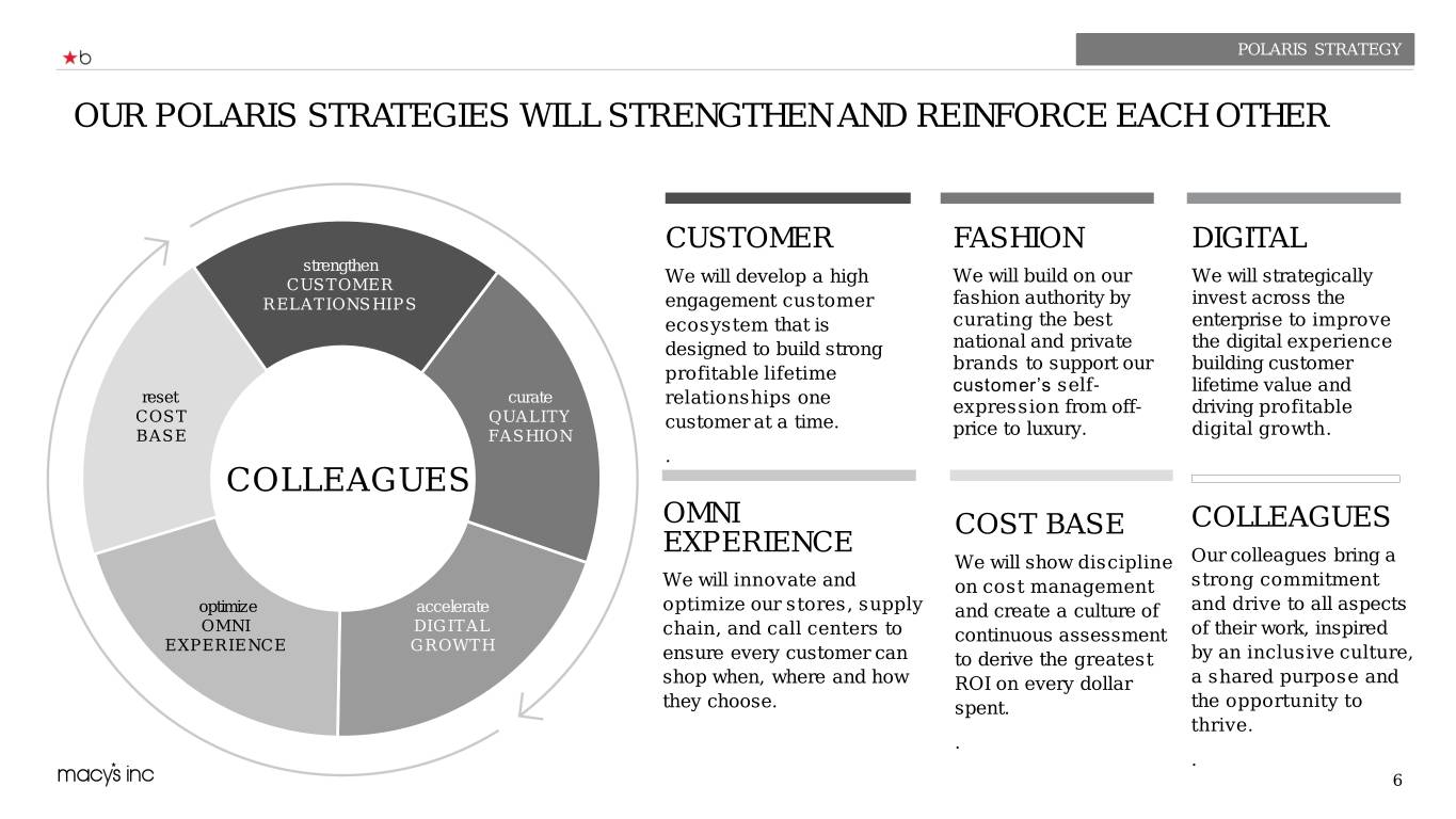 POLARIS STRATEGY OUR VISION IS TO BE THE LEADING MULTI-BRANDED FASHION RETAILER FROM OFF-PRICE TO LUXURY, FROM ONLINE TO OFFLINE, FROM ON-MALL TO OFF-MALL WE WILL OFFER CONVENIENT ACCESS TO THE FULLNESS OF OUR BRANDS Our customers want great fashion Our customers are omni-shoppers. Our customers come to us for the special and brands. moments of life. We are committed to ensuring that Macy’s, Inc. will be a great place to work and shop. 5
