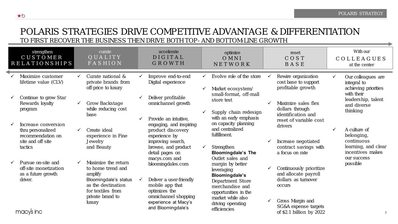 POLARIS STRATEGY OUR POLARIS STRATEGIES WILL STRENGTHEN AND REINFORCE EACH OTHER CUSTOMER FASHION DIGITAL strengthen CUST OM ER We will develop a high We will build on our We will strategically RELATIONSHIPS engagement customer fashion authority by invest across the ecosystem that is curating the best enterprise to improve designed to build strong national and private the digital experience brands to support our building customer profitable lifetime customer’s self- lifetime value and reset curate relationships one expression from off- driving profitable COST QUALIT Y customer at a time. BASE FASHION price to luxury. digital growth. . COLLEAGUES OMNI COST BASE COLLEAGUES EXPERIENCE We will show discipline Our colleagues bring a We will innovate and on cost management strong commitment optimize accelerate optimize our stores, supply and create a culture of and drive to all aspects OM NI DIGITAL chain, and call centers to continuous assessment of their work, inspired EXPERIENCE GROWTH ensure every customer can to derive the greatest by an inclusive culture, shop when, where and how ROI on every dollar a shared purpose and they choose. spent. the opportunity to thrive. . . 6