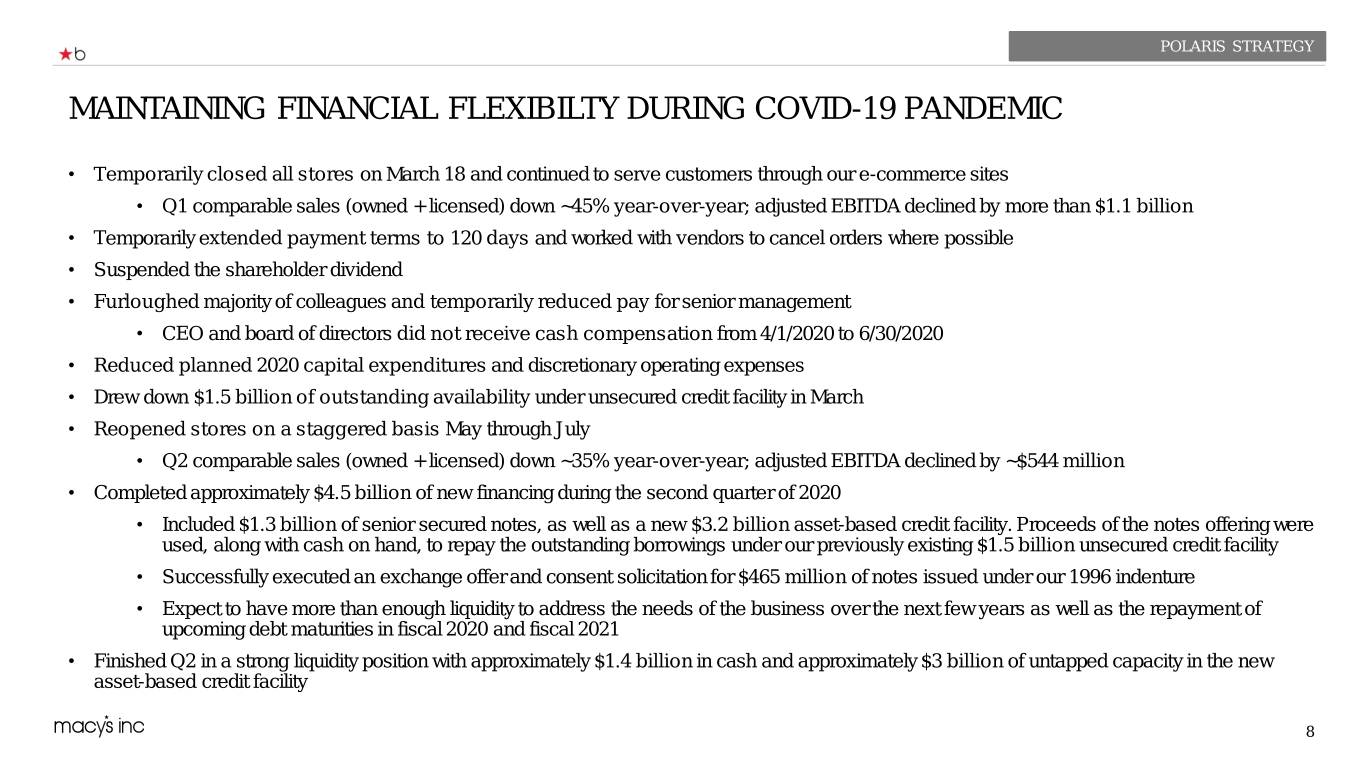 POLARIS STRATEGY MAINTAINING FINANCIAL FLEXIBILTY DURING COVID-19 PANDEMIC • Temporarily closed all stores on March 18 and continued to serve customers through our e-commerce sites • Q1 comparable sales (owned + licensed) down ~45% year-over-year; adjusted EBITDA declined by more than $1.1 billion • Temporarily extended payment terms to 120 days and worked with vendors to cancel orders where possible • Suspended the shareholder dividend • Furloughed majority of colleagues and temporarily reduced pay for senior management • CEO and board of directors did not receive cash compensation from 4/1/2020 to 6/30/2020 • Reduced planned 2020 capital expenditures and discretionary operating expenses • Drew down $1.5 billion of outstanding availability under unsecured credit facility in March • Reopened stores on a staggered basis May through July • Q2 comparable sales (owned + licensed) down ~35% year-over-year; adjusted EBITDA declined by ~$544 million • Completed approximately $4.5 billion of new financing during the second quarter of 2020 • Included $1.3 billion of senior secured notes, as well as a new $3.2 billion asset-based credit facility. Proceeds of the notes offering were used, along with cash on hand, to repay the outstanding borrowings under our previously existing $1.5 billion unsecured credit facility • Successfully executed an exchange offer and consent solicitation for $465 million of notes issued under our 1996 indenture • Expect to have more than enough liquidity to address the needs of the business over the next few years as well as the repayment of upcoming debt maturities in fiscal 2020 and fiscal 2021 • Finished Q2 in a strong liquidity position with approximately $1.4 billion in cash and approximately $3 billion of untapped capacity in the new asset-based credit facility 8