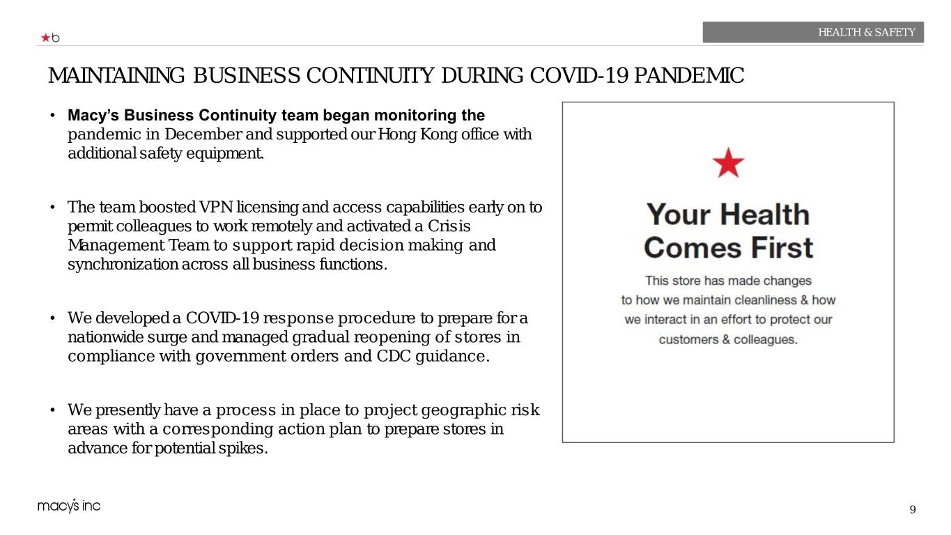 HEALTH & SAFETY MAINTAINING BUSINESS CONTINUITY DURING COVID-19 PANDEMIC • Macy’s Business Continuity team began monitoring the pandemic in December and supported our Hong Kong office with additional safety equipment. • The team boosted VPN licensing and access capabilities early on to permit colleagues to work remotely and activated a Crisis Management Team to support rapid decision making and synchronization across all business functions. • We developed a COVID-19 response procedure to prepare for a nationwide surge and managed gradual reopening of stores in compliance with government orders and CDC guidance. • We presently have a process in place to project geographic risk areas with a corresponding action plan to prepare stores in advance for potential spikes. 9