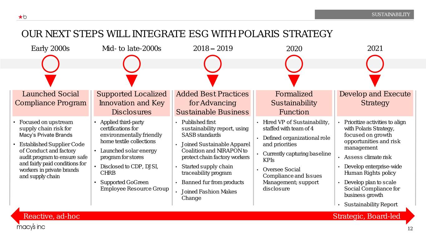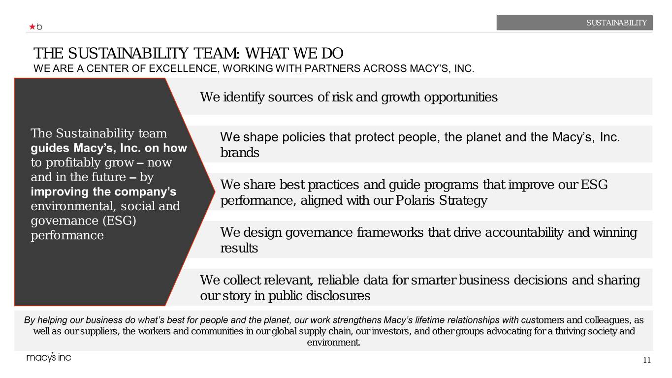 SUSTAINABILITY OUR NEXT STEPS WILL INTEGRATE ESG WITH POLARIS STRATEGY Early 2000s Mid- to late-2000s 2018 – 2019 2020 2021 Launched Social Supported Localized Added Best Practices Formalized Develop and Execute Compliance Program Innovation and Key for Advancing Sustainability Strategy Disclosures Sustainable Business Function • Focused on upstream • Applied third-party • Published first • Hired VP of Sustainability, • Prioritize activities to align supply chain risk for certifications for sustainability report, using staffed with team of 4 with Polaris Strategy, Macy’s Private Brands environmentally friendly SASB standards focused on growth • Defined organizational role home textile collections opportunities and risk • Established Supplier Code • Joined Sustainable Apparel and priorities management of Conduct and factory • Launched solar energy Coalition and NIRAPON to • Currently capturing baseline audit program to ensure safe program for stores protect chain factory workers • Assess climate risk KPIs and fairly paid conditions for • Disclosed to CDP, DJSI, • Started supply chain • Develop enterprise-wide workers in private brands • Oversee Social CHRB traceability program Human Rights policy and supply chain Compliance and Issues • Supported GoGreen • Banned fur from products Management; support • Develop plan to scale Employee Resource Group disclosure Social Compliance for • Joined Fashion Makes business growth Change • Sustainability Report Reactive, ad-hoc Strategic, Board-led 12