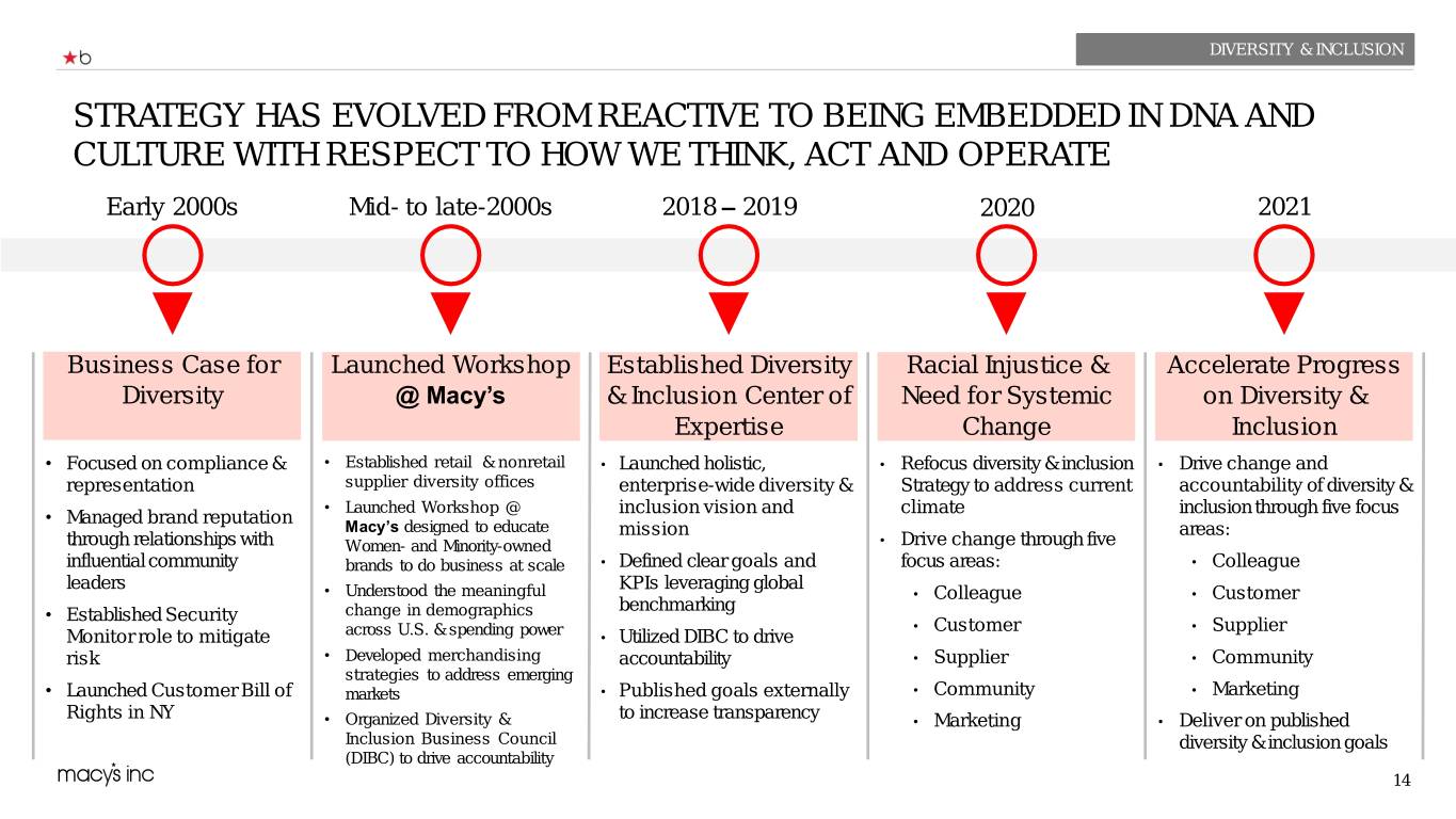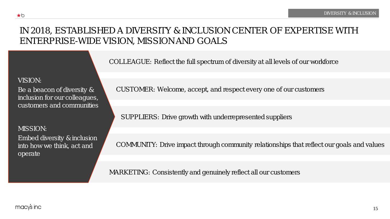 DIVERSITY & INCLUSION STRATEGY HAS EVOLVED FROM REACTIVE TO BEING EMBEDDED IN DNA AND CULTURE WITH RESPECT TO HOW WE THINK, ACT AND OPERATE Early 2000s Mid- to late-2000s 2018 – 2019 2020 2021 Business Case for Launched Workshop Established Diversity Racial Injustice & Accelerate Progress Diversity @ Macy’s & Inclusion Center of Need for Systemic on Diversity & Expertise Change Inclusion • Focused on compliance & • Established retail & nonretail • Launched holistic, • Refocus diversity & inclusion • Drive change and representation supplier diversity offices enterprise-wide diversity & Strategy to address current accountability of diversity & • Launched Workshop @ inclusion vision and climate inclusion through five focus • Managed brand reputation Macy’s designed to educate mission areas: through relationships with Women- and Minority-owned • Drive change through five influential community brands to do business at scale • Defined clear goals and focus areas: • Colleague leaders KPIs leveraging global • Understood the meaningful • Colleague • Customer benchmarking • Established Security change in demographics across U.S. & spending power • Customer • Supplier Monitor role to mitigate • Utilized DIBC to drive risk • Developed merchandising accountability • Supplier • Community strategies to address emerging • Launched Customer Bill of markets • Published goals externally • Community • Marketing Rights in NY to increase transparency • Organized Diversity & • Marketing • Deliver on published Inclusion Business Council diversity & inclusion goals (DIBC) to drive accountability 14