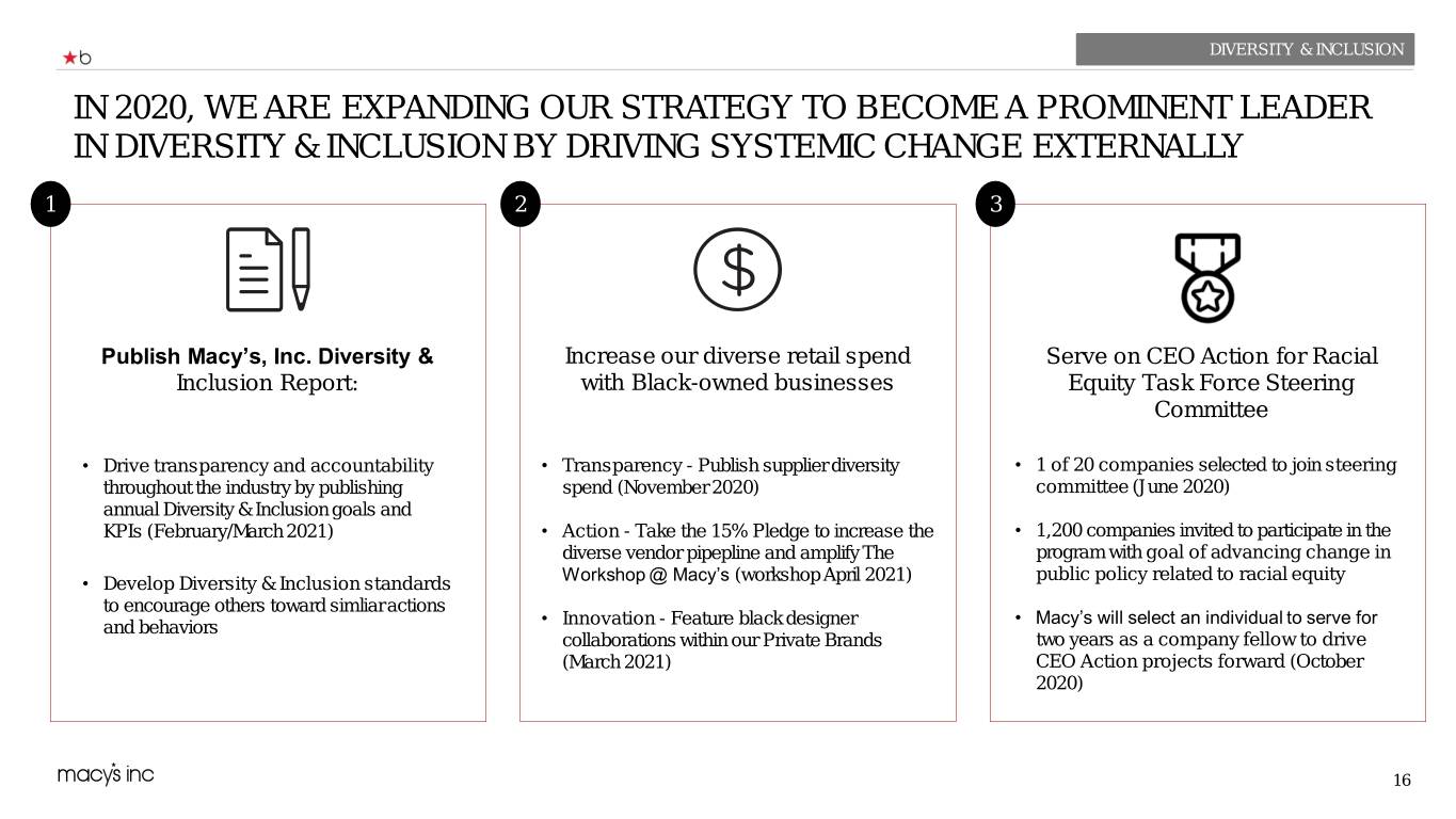 DIVERSITY & INCLUSION IN 2020, WE ARE EXPANDING OUR STRATEGY TO BECOME A PROMINENT LEADER IN DIVERSITY & INCLUSION BY DRIVING SYSTEMIC CHANGE EXTERNALLY 1 2 3 Publish Macy’s, Inc. Diversity & Increase our diverse retail spend Serve on CEO Action for Racial Inclusion Report: with Black-owned businesses Equity Task Force Steering Committee • Drive transparency and accountability • Transparency - Publish supplier diversity • 1 of 20 companies selected to join steering throughout the industry by publishing spend (November 2020) committee (June 2020) annual Diversity & Inclusion goals and KPIs (February/March 2021) • Action - Take the 15% Pledge to increase the • 1,200 companies invited to participate in the diverse vendor pipepline and amplify The program with goal of advancing change in public policy related to racial equity • Develop Diversity & Inclusion standards Workshop @ Macy’s (workshop April 2021) to encourage others toward simliar actions • Macy’s will select an individual to serve for and behaviors • Innovation - Feature black designer collaborations within our Private Brands two years as a company fellow to drive (March 2021) CEO Action projects forward (October 2020) 16