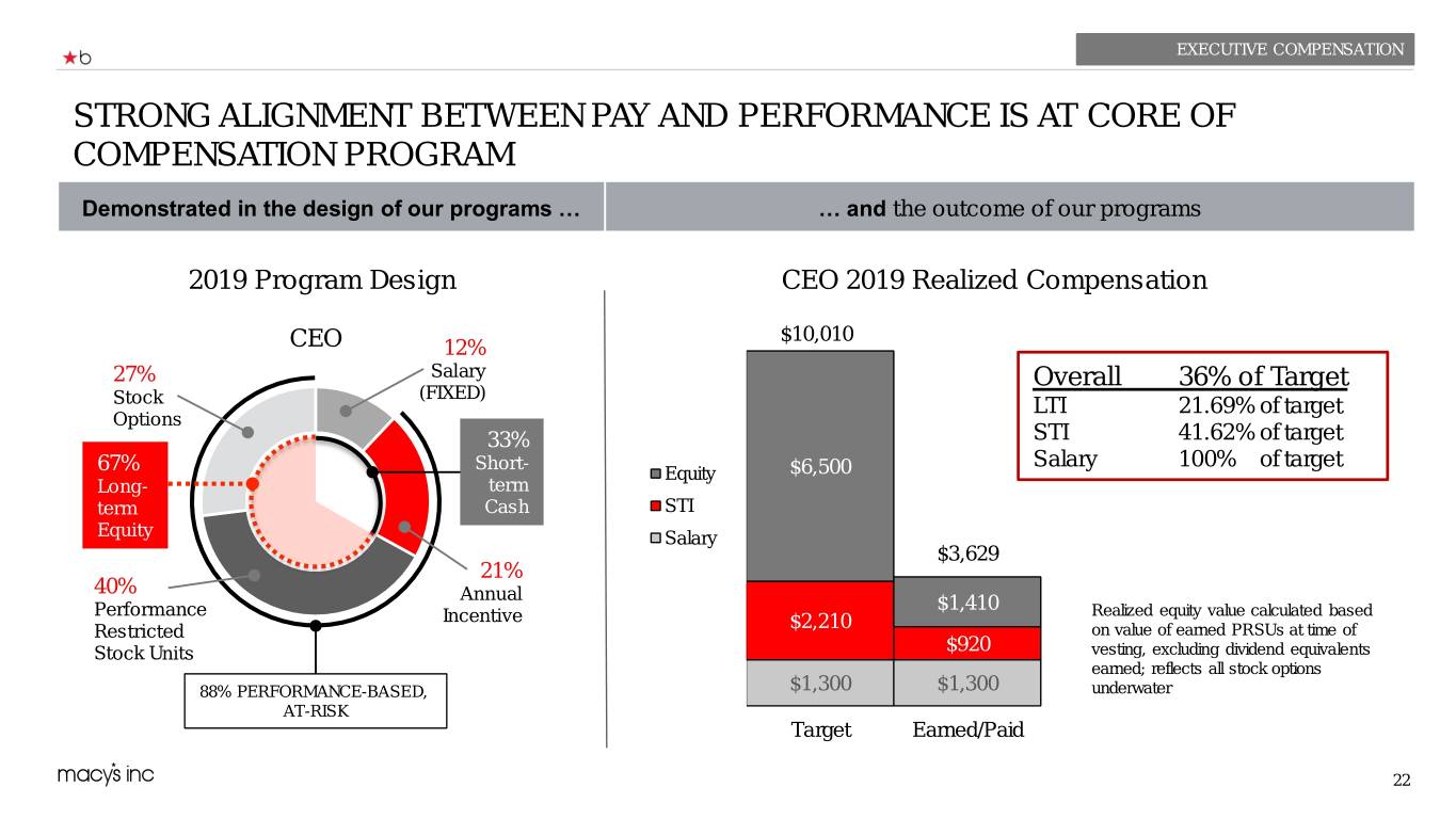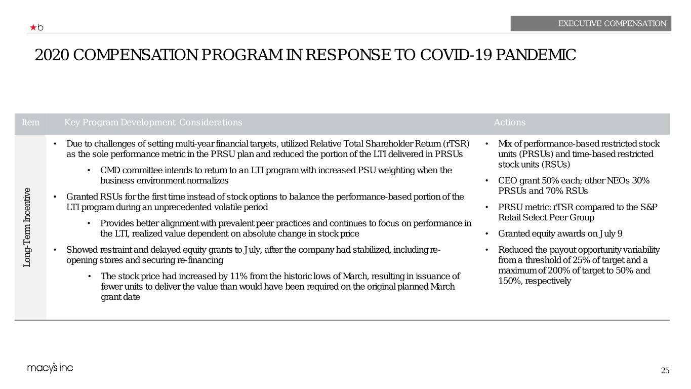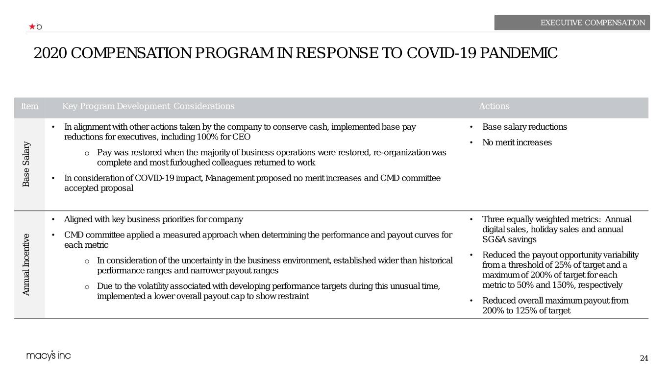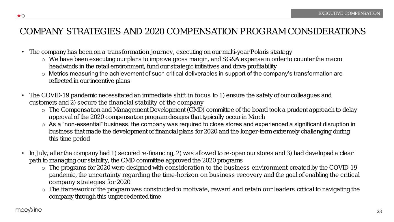 EXECUTIVE COMPENSATION COMPANY STRATEGIES AND 2020 COMPENSATION PROGRAM CONSIDERATIONS • The company has been on a transformation journey, executing on our multi-year Polaris strategy o We have been executing our plans to improve gross margin, and SG&A expense in order to counter the macro headwinds in the retail environment, fund our strategic initiatives and drive profitability o Metrics measuring the achievement of such critical deliverables in support of the company’s transformation are reflected in our incentive plans • The COVID-19 pandemic necessitated an immediate shift in focus to 1) ensure the safety of our colleagues and customers and 2) secure the financial stability of the company o The Compensation and Management Development (CMD) committee of the board took a prudent approach to delay approval of the 2020 compensation program designs that typically occur in March o As a “non-essential” business, the company was required to close stores and experienced a significant disruption in business that made the development of financial plans for 2020 and the longer-term extremely challenging during this time period • In July, after the company had 1) secured re-financing, 2) was allowed to re-open our stores and 3) had developed a clear path to managing our stability, the CMD committee approved the 2020 programs o The programs for 2020 were designed with consideration to the business environment created by the COVID-19 pandemic, the uncertainty regarding the time-horizon on business recovery and the goal of enabling the critical company strategies for 2020 o The framework of the program was constructed to motivate, reward and retain our leaders critical to navigating the company through this unprecedented time 23