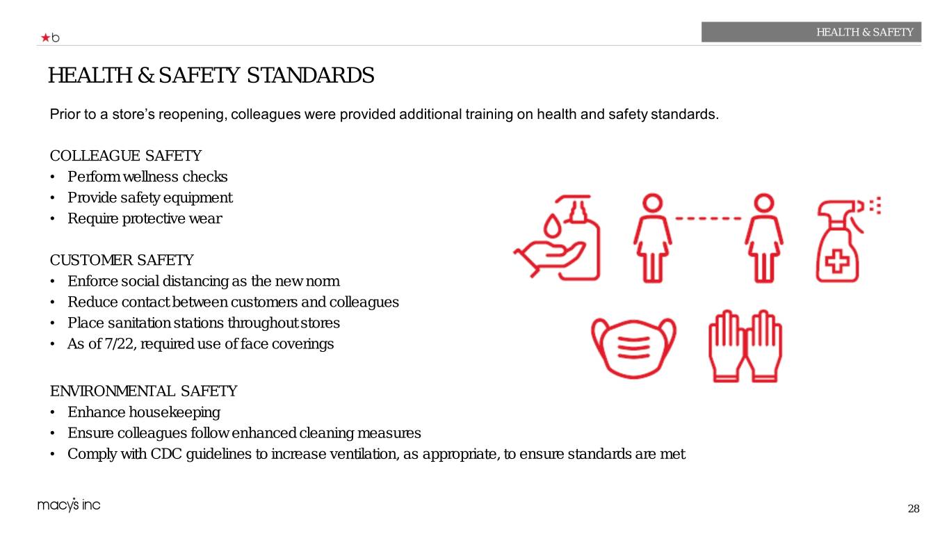 HEALTH & SAFETY HEALTH & SAFETY STANDARDS Prior to a store’s reopening, colleagues were provided additional training on health and safety standards. COLLEAGUE SAFETY • Perform wellness checks • Provide safety equipment • Require protective wear CUSTOMER SAFETY • Enforce social distancing as the new norm • Reduce contact between customers and colleagues • Place sanitation stations throughout stores • As of 7/22, required use of face coverings ENVIRONMENTAL SAFETY • Enhance housekeeping • Ensure colleagues follow enhanced cleaning measures • Comply with CDC guidelines to increase ventilation, as appropriate, to ensure standards are met 28