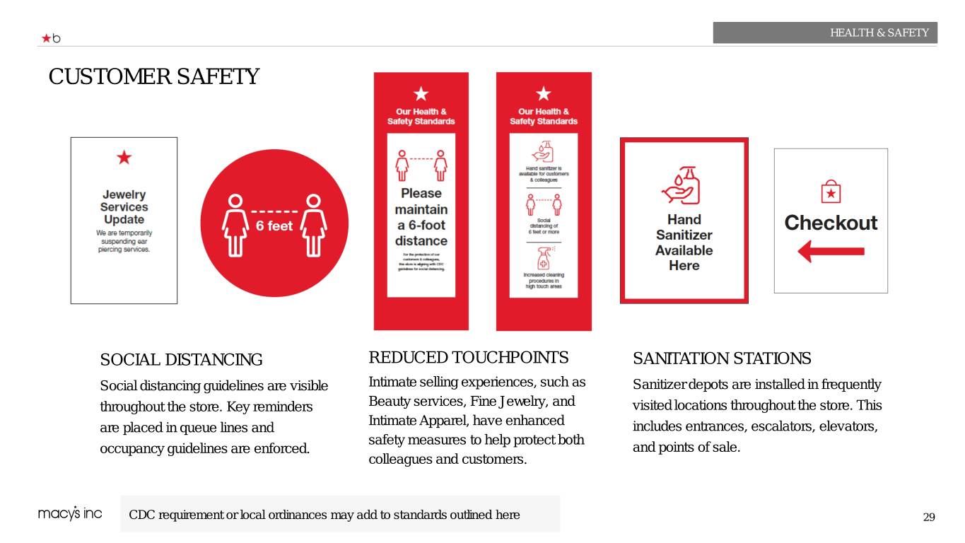 HEALTH & SAFETY CUSTOMER SAFETY SOCIAL DISTANCING REDUCED TOUCHPOINTS SANITATION STATIONS Social distancing guidelines are visible Intimate selling experiences, such as Sanitizer depots are installed in frequently throughout the store. Key reminders Beauty services, Fine Jewelry, and visited locations throughout the store. This Intimate Apparel, have enhanced are placed in queue lines and includes entrances, escalators, elevators, safety measures to help protect both occupancy guidelines are enforced. and points of sale. colleagues and customers. CDC requirement or local ordinances may add to standards outlined here 29