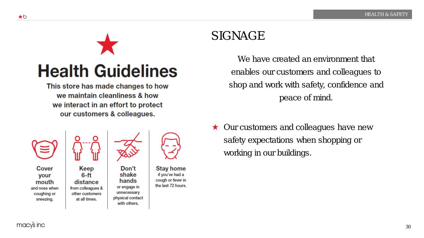 HEALTH & SAFETY SIGNAGE We have created an environment that enables our customers and colleagues to shop and work with safety, confidence and peace of mind. Our customers and colleagues have new safety expectations when shopping or working in our buildings. 30