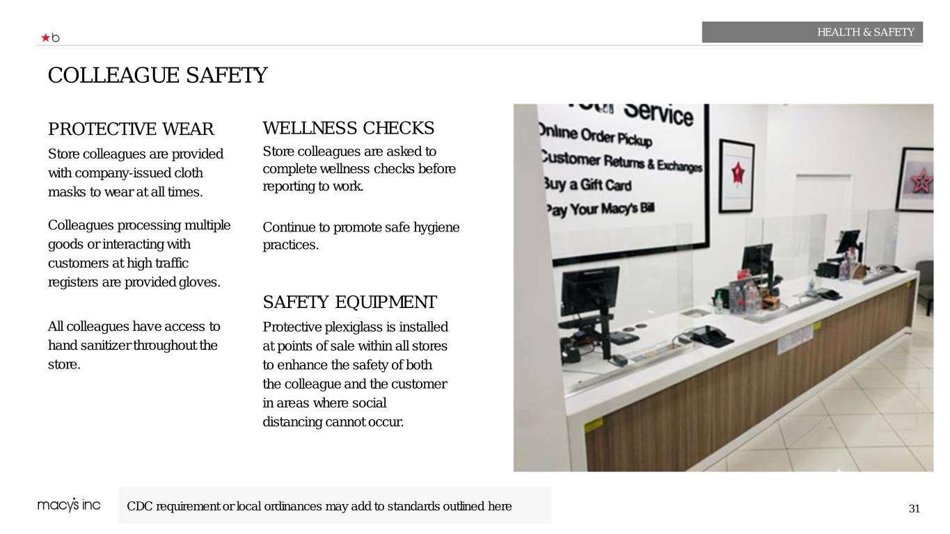HEALTH & SAFETY COLLEAGUE SAFETY PROTECTIVE WEAR WELLNESS CHECKS Store colleagues are provided Store colleagues are asked to with company-issued cloth complete wellness checks before masks to wear at all times. reporting to work. Colleagues processing multiple Continue to promote safe hygiene goods or interacting with practices. customers at high traffic registers are provided gloves. SAFETY EQUIPMENT All colleagues have access to Protective plexiglass is installed hand sanitizer throughout the at points of sale within all stores store. to enhance the safety of both the colleague and the customer in areas where social distancing cannot occur. CDC requirement or local ordinances may add to standards outlined here 31