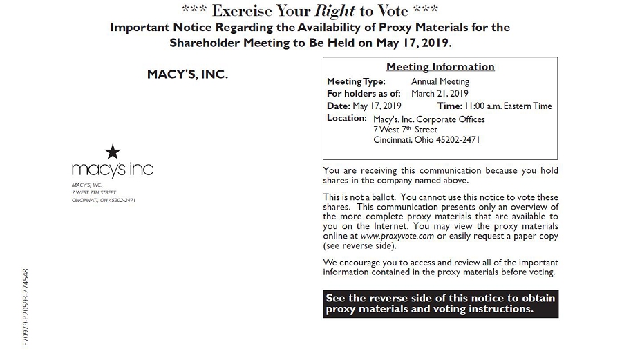 *** Exercise Your Right to Vote *** Important Notice Regarding the Availability of Proxy Materials for the Shareholder Meeting to Be Held on May 17, 2019. Meeting Information MACY'S, INC. Meeting Type: Annual Meeting For holders as of: March 21, 2019 Date: May 17, 2019 Time: 11:00 a.m. Eastern Time Location: Macy's, Inc. Corporate Offices 7 West 7th Street Cincinnati, Ohio 45202-2471 You are receiving this communication because you hold shares in the company named above. This is not a ballot. You cannot use this notice to vote these shares. This communication presents only an overview of the more complete proxy materials that are available to you on the Internet. You may view the proxy materials online at www.proxyvote.com or easily request a paper copy (see reverse side). We encourage you to access and review all of the important information contained in the proxy materials before voting. MACY'S, INC. 7 WEST 7TH STREET CINCINNATI, OH 45202-2471 E70979-P20593-Z74548 See the reverse side of this notice to obtain proxy materials and voting instructions.