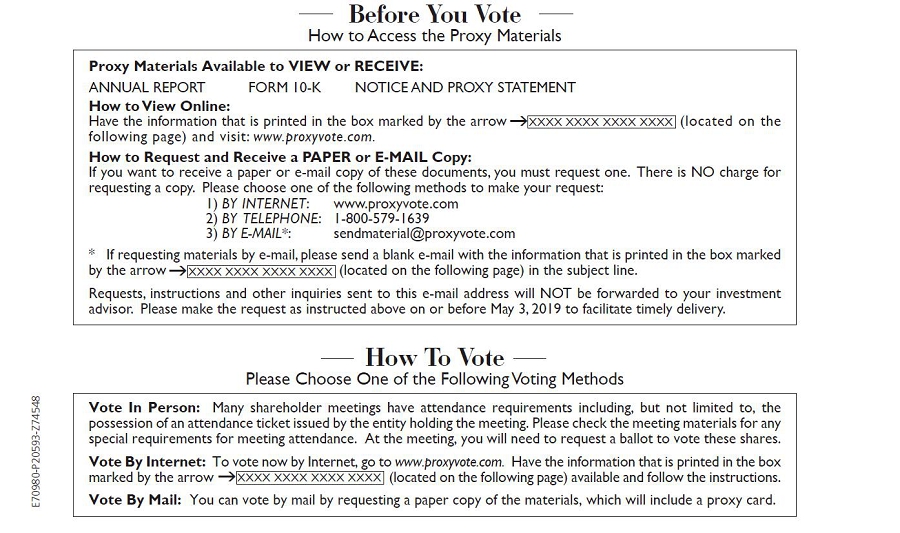 E70980-P20593-Z74548 Vote In Person: Many shareholder meetings have attendance requirements including, but not limited to, the possession of an attendance ticket issued by the entity holding the meeting. Please check the meeting materials for any special requirements for meeting attendance. At the meeting, you will need to request a ballot to vote these shares. Vote By Internet: To vote now by Internet, go to www.proxyvote.com. Have the information that is printed in the box marked by the arrow (located on the following page) available and follow the instructions. Vote By Mail: You can vote by mail by requesting a paper copy of the materials, which will include a proxy card. How to View Online: Have the information that is printed in the box marked by the arrow (located on the following page) and visit: www.proxyvote.com. How to Request and Receive a PAPER or E-MAIL Copy: If you want to receive a paper or e-mail copy of these documents, you must request one. There is NO charge for requesting a copy. Please choose one of the following methods to make your request: 1) BY INTERNET: www.proxyvote.com 2) BY TELEPHONE: 1-800-579-1639 3) BY E-MAIL*: sendmaterial@proxyvote.com * If requesting materials by e-mail, please send a blank e-mail with the information that is printed in the box marked by the arrow (located on the following page) in the subject line. Proxy Materials Available to VIEW or RECEIVE: XXXX XXXX XXXX XXXX Before You Vote How to Access the Proxy Materials How To Vote Please Choose One of the Following Voting Methods Requests, instructions and other inquiries sent to this e-mail address will NOT be forwarded to your investment advisor. Please make the request as instructed above on or before May 3, 2019 to facilitate timely delivery. ANNUAL REPORT FORM 10-K NOTICE AND PROXY STATEMENT XXXX XXXX XXXX XXXX XXXX XXXX XXXX XXXX