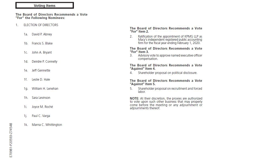 E70981-P20593-Z74548 Voting Items The Board of Directors Recommends a Vote "For" the Following Nominees: 1. ELECTION OF DIRECTORS 1b. Francis S. Blake 1a. David P. Abney 1c. John A. Bryant 1d. Deirdre P. Connelly 1e. Jeff Gennette 1f. Leslie D. Hale 1g. William H. Lenehan 1h. Sara Levinson 1i. Joyce M. Roché 1j. Paul C. Varga 1k. Marna C. Whittington 2. Ratification of the appointment of KPMG LLP as Macy's independent registered public accounting firm for the fiscal year ending February 1, 2020. 3. Advisory vote to approve named executive officer compensation. The Board of Directors Recommends a Vote "For" Item 2. The Board of Directors Recommends a Vote "For" Item 3. The Board of Directors Recommends a Vote “Against” Item 4. 4. Shareholder proposal on political disclosure. The Board of Directors Recommends a Vote “Against” Item 5. 5. Shareholder proposal on recruitment and forced labor. NOTE: At their discretion, the proxies are authorized to vote upon such other business that may properly come before the meeting or any adjournment or adjournments thereof.