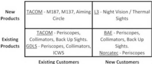 Optex Systems Holdings manufactures optical sighting systems and assemblies primarily for United States Department of Defense applications. Optical sighting systems are used to enable a soldier to have improved vision and in some cases, protected vision. One type of system would be a binocular which would have a special optical filter applied to the external lens which would block long wave length light (from a laser) from reaching the soldier’s eyes. Another type of system would be a periscope where the soldier inside an armored vehicle needs to view the external environment outside of the tank. In this case, the visual path is reflected at two 90 degree angles enabling the soldier to be at a different plane than that of the external lens.