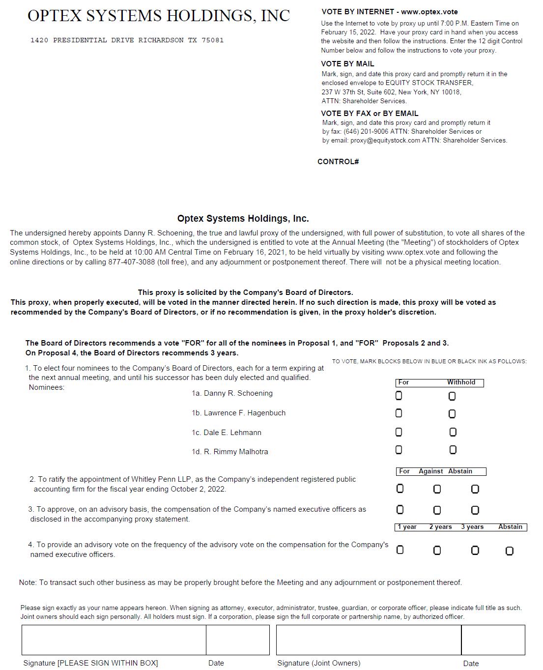 You are cordially invited to attend the 2022 Annual Meeting of Shareholders (the “Annual Meeting”) of Optex Systems Holdings, Inc., a Delaware corporation (the “Company”), to be held virtually at 10:00 a.m. Central Time on February 16, 2022, to consider and vote upon the following proposals: