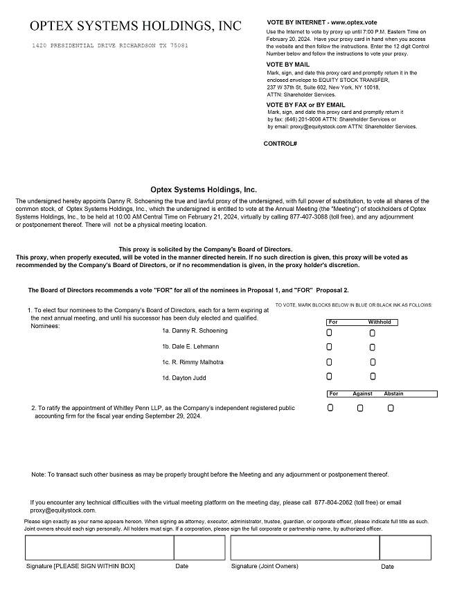 You are cordially invited to attend the 2024 Annual Meeting of Shareholders (the “Annual Meeting”) of Optex Systems Holdings, Inc., a Delaware corporation (the “Company”), to be held virtually at 10:00 a.m. Central Time on February 21, 2024, to consider and vote upon the following proposals: