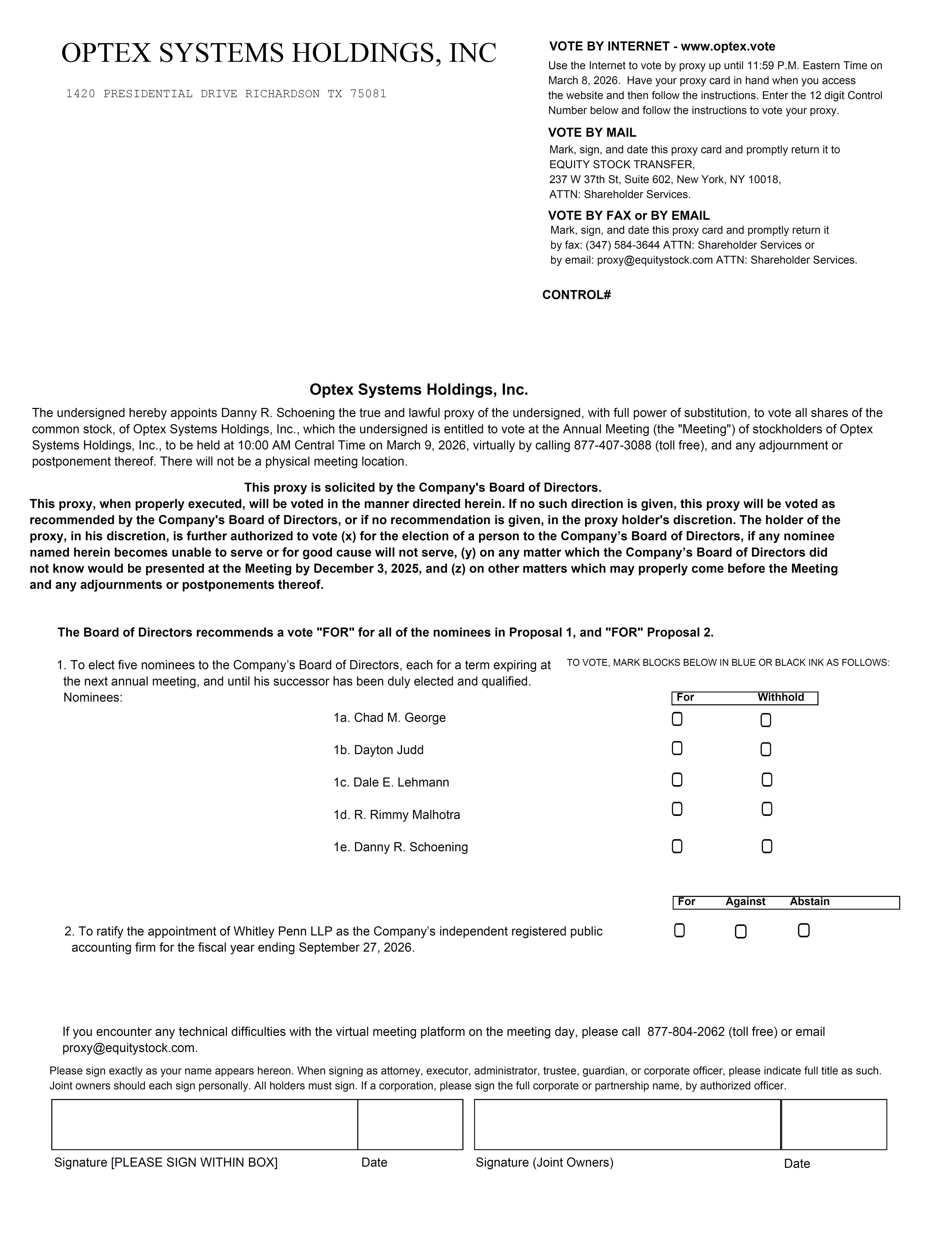 Electronic copies of this proxy statement, the accompanying proxy card and notice of Annual Meeting and the Company’s Annual Report on Form 10-K for the fiscal year ended September 28, 2025 are available at www.optex.vote and at https://ir.stockpr.com/optexsys/all-sec-filings. All materials will remain posted at least until the conclusion of the Annual Meeting.