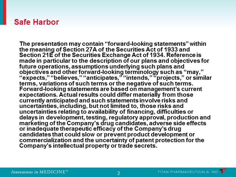 2 The presentation may contain “forward - looking statements” within the meaning of Section 27A of the Securities Act of 1933 and Section 21E of the Securities Exchange Act of 1934. Reference is made in particular to the description of our plans and objectives for future operations, assumptions underlying such plans and objectives and other forward - looking terminology such as “may,” “expects,” “believes,” “anticipates,” “intends,” “projects,” or similar terms, variations of such terms or the negative of such terms. Forward - looking statements are based on management’s current expectations. Actual results could differ materially from those currently anticipated and such statements involve risks and uncertainties, including, but not limited to, those risks and uncertainties relating to availability of financing, difficulties or delays in development, testing, regulatory approval, production and marketing of the Company's drug candidates, adverse side effects or inadequate therapeutic efficacy of the Company's drug candidates that could slow or prevent product development or commercialization and the uncertainty of patent protection for the Company's intellectual property or trade secrets. Safe Harbor