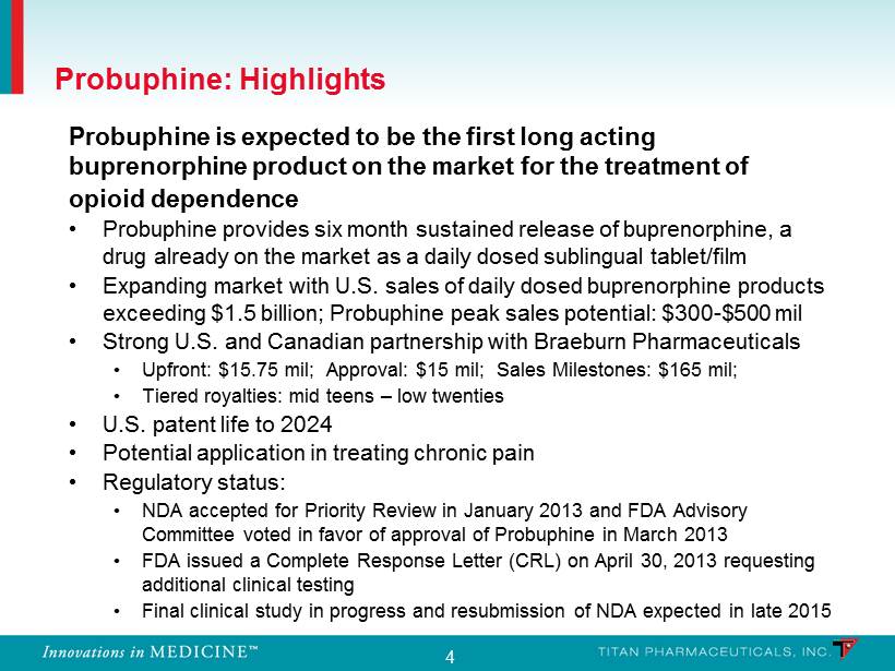 3 Titan Pharmaceuticals Overview Titan Pharmaceuticals is a specialty pharmaceutical company focused on developing innovative treatments for chronic conditions based on its proprietary long - term drug delivery platform, ProNeura ™ • Probuphine ® : A long acting formulation of buprenorphine for the maintenance treatment of opioid dependence • Final Phase 3 clinical study requested by the FDA in progress; expected completion by mid year 2015 and resubmission of the NDA in late 2015 • Partnership established for the U.S. and Canadian rights on attractive terms • Potential application in treatment of chronic pain • ProNeura for Parkinson’s disease ( Ropinirole ) • Non clinical proof - of - principle study completed in primate model of PD • Expect to file Investigational New Drug application with FDA in 2015 • ProNeura Technology Platform • Proprietary long - term drug delivery technology providing around - the - clock medication over periods of six months to a year • Applications in chronic conditions where clinical benefit could be achieved by continuous, stable medication levels in the blood