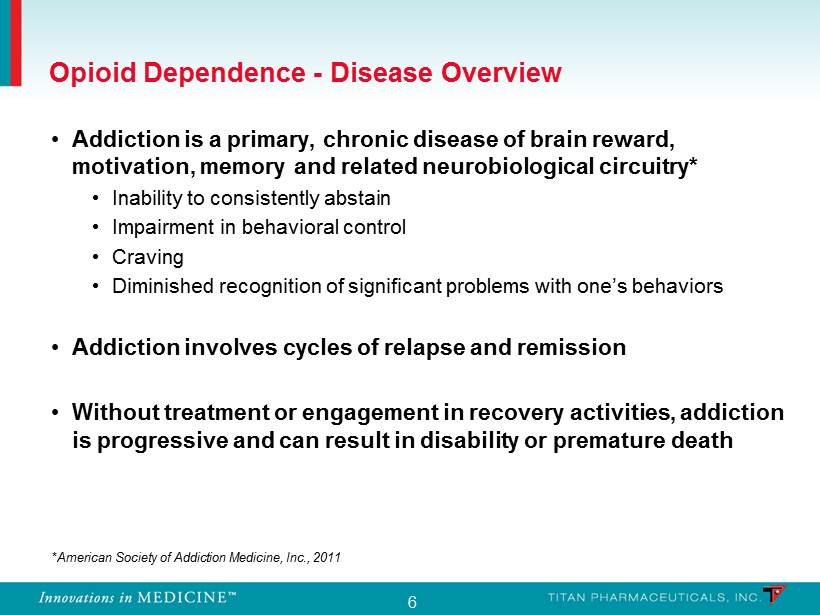 5 Recognized as an epidemic by the federal government • Opioid dependence is recognized by the government as a medical epidemic that warrants immediate and significant resource allocation • NIDA (part of NIH) provided a $7.6 million grant (2010 - 2011) in support of Probuphine development Sources: EPIDEMIC: RESPONDING TO AMERICA’S PRESCRIPTION DRUG ABUSE CRISIS, Executive Office of the President of the United St ate s (2011); 2009 National Survey on Drug Use and Health (NSDUH); “A Wave of Addiction and Crime, with the Medicine Cabinet to Blame”, New York Ti mes (Sept 23, 2010) ER Visits Due to Opioid Misuse 0.05 0.10 0.15 0.20 0.25 0.30 0.35 0.40 0.45 2004 2005 2006 2007 2008 2009 MM of Patient Visits 240% increase in 6 years Opioid Dependence - Viewed as an Epidemic