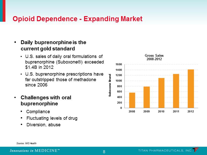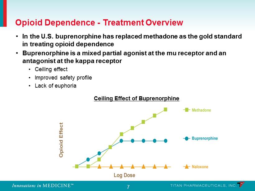7 • In the U.S. buprenorphine has replaced methadone as the gold standard in treating opioid dependence • Buprenorphine is a mixed partial agonist at the mu receptor and an antagonist at the kappa receptor • Ceiling effect • Improved safety profile • Lack of euphoria Ceiling Effect of Buprenorphine Opioid Dependence - Treatment Overview
