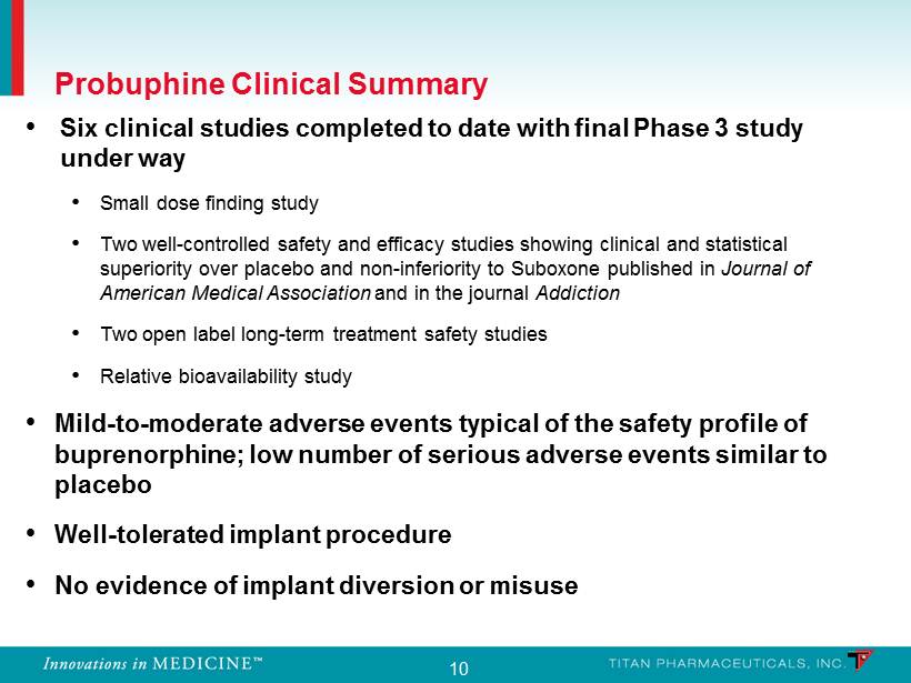 9 EVA polymer Buprenorphine Blended & Extruded 26 mm long, 2.5 mm diameter Each implant contains 80 mg of buprenorphine HCl which has been blended and extruded with ethylene vinyl acetate (EVA) co - polymer Probuphine is a subdermal implant capable of delivering continuous and persistent around the clock blood levels of buprenorphine for 6 months following a single treatment, enhancing patient compliance and retention Inert component of several approved products Approved for treatment of opioid addiction, and acute and chronic pain Probuphine Probuphine : Active Buprenorphine Along with Inert EVA Polymer
