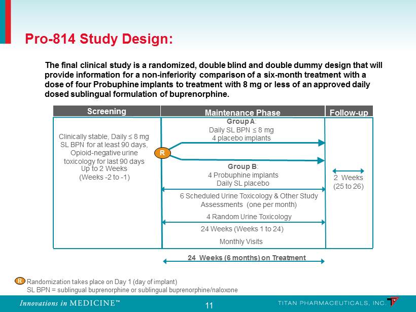 11 Pro - 814 Study Design: Follow - up 24 Weeks (Weeks 1 to 24) Monthly Visits Group A : Daily SL BPN ≤ 8 mg 4 placebo implants Screening R Clinically stable, Daily ≤ 8 mg SL BPN for at least 90 days, Opioid - negative urine toxicology for last 90 days Maintenance Phase 2 Weeks (25 to 26) Up to 2 Weeks (Weeks - 2 to - 1) 24 Weeks (6 months) on Treatment SL BPN = sublingual buprenorphine or sublingual buprenorphine/naloxone 6 Scheduled Urine Toxicology & Other Study Assessments (one per month) 4 Random Urine Toxicology R Randomization takes place on Day 1 (day of implant) Group B : 4 Probuphine implants Daily SL placebo The final clinical study is a randomized, double blind and double dummy design that will provide information for a non - inferiority comparison of a six - month treatment with a dose of four Probuphine implants to treatment with 8 mg or less of an approved daily dosed sublingual formulation of buprenorphine.