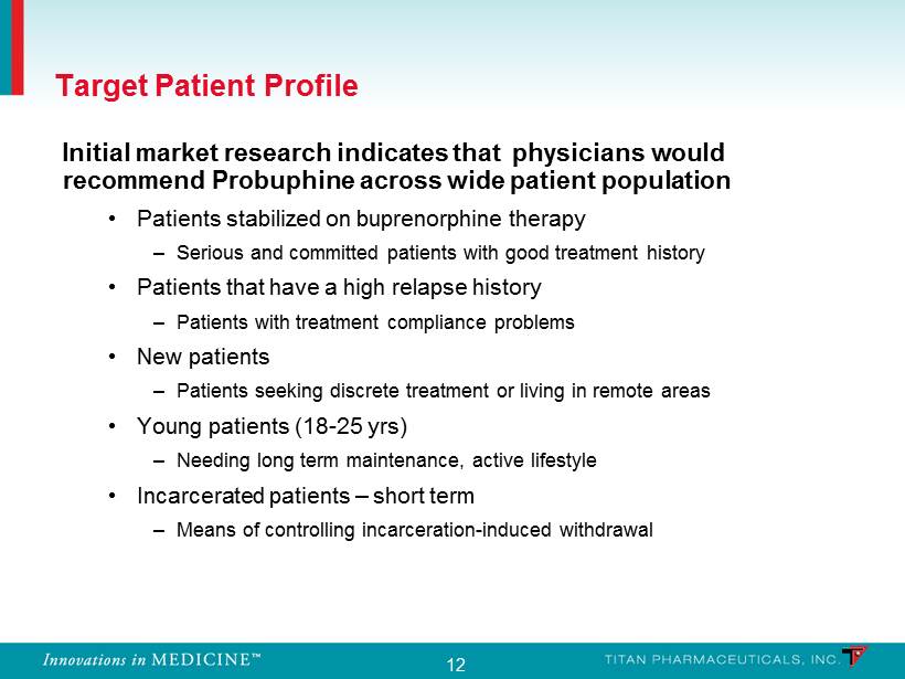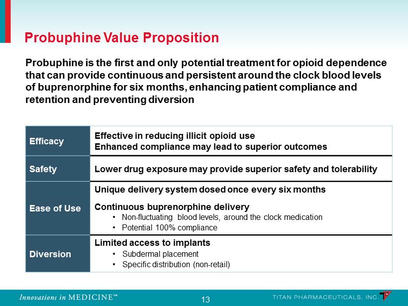 12 Initial market research indicates that physicians would recommend Probuphine across wide patient population • Patients stabilized on buprenorphine therapy – Serious and committed patients with good treatment history • Patients that have a high relapse history – Patients with treatment compliance problems • New patients – Patients seeking discrete treatment or living in remote areas • Young patients (18 - 25 yrs ) – Needing long term maintenance, active lifestyle • Incarcerated patients – short term – Means of controlling incarceration - induced withdrawal Target Patient Profile