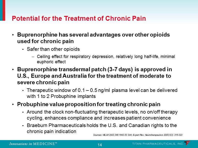 13 Efficacy Effective in reducing illicit opioid use Enhanced compliance may lead to superior outcomes Safety Lower drug exposure may provide superior safety and tolerability Ease of Use Unique delivery system dosed once every six months Continuous buprenorphine delivery • Non - fluctuating blood levels, around the clock medication • Potential 100% compliance Diversion Limited access to implants • Subdermal placement • Specific distribution (non - retail) Probuphine Value Proposition Probuphine is the first and only potential treatment for opioid dependence that can provide continuous and persistent around the clock blood levels of buprenorphine for six months, enhancing patient compliance and retention and preventing diversion