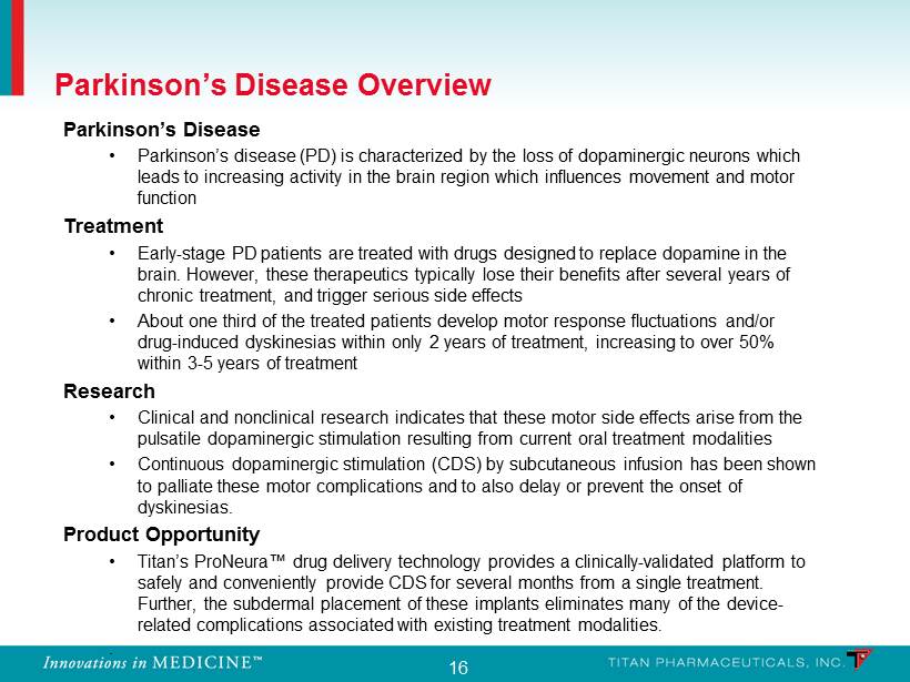 15 Titan: Adding Value Beyond Probuphine Proprietary ProNeura Technology Platform • Novel long - term drug delivery technology providing around - the - clock medication over periods of six months to a year clinically validated through the Probuphine program • Applicable to other chronic treatments where clinical benefit is possible through: – Low dose around the clock drug administration – Stable blood level of medication – Subdermal drug delivery eliminating first - pass metabolic effects • Product development program in Parkinson’s disease in progress – Established non - clinical proof of concept with continuous dopamine agonist treatment in a PD model with funding from NIH grants • Evaluation of additional compounds in other disease settings underway • Titan has an expert team in place with an established product development track record