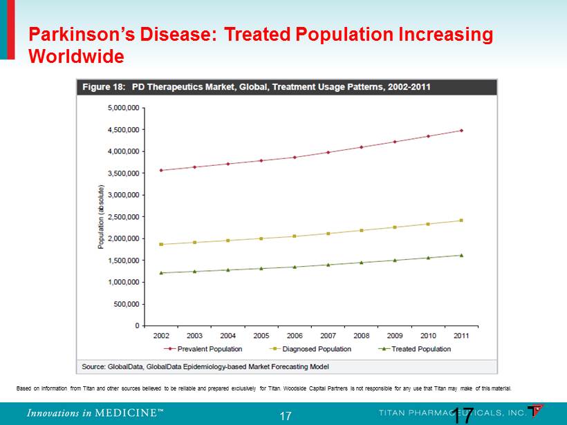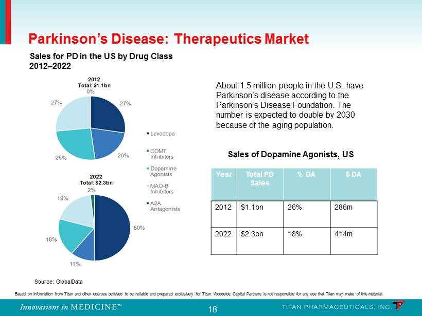 17 Parkinson’s Disease: Treated Population Increasing Worldwide 17 Based on information from Titan and other sources believed to be reliable and prepared exclusively for Titan. Woodside Capita l P artners is not responsible for any use that Titan may make of this material.