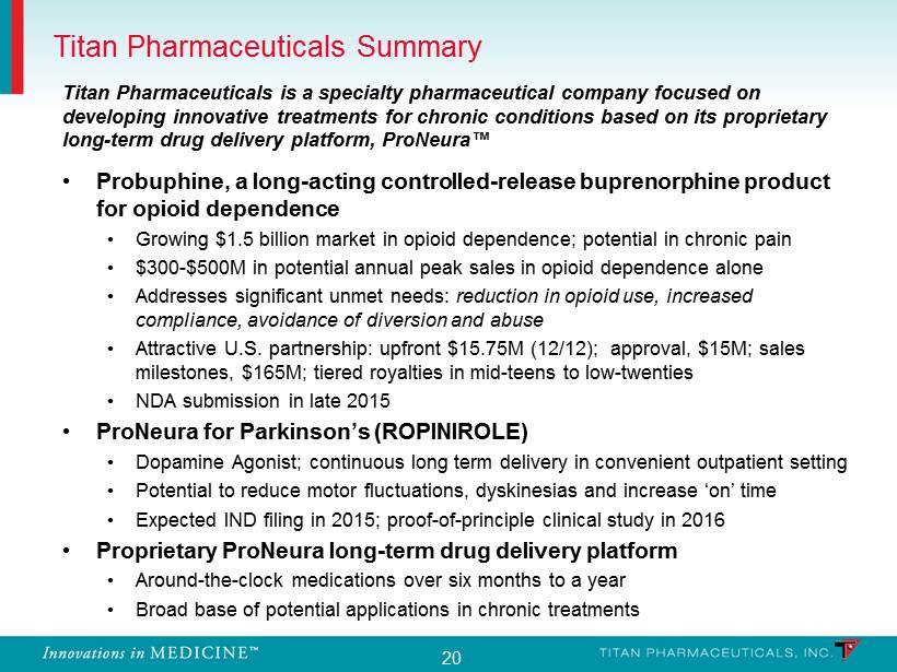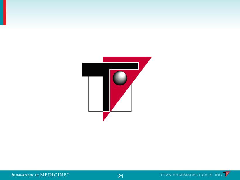 20 Titan Pharmaceuticals is a specialty pharmaceutical company focused on developing innovative treatments for chronic conditions based on its proprietary long - term drug delivery platform, ProNeura™ • Probuphine, a long - acting controlled - release buprenorphine product for opioid dependence • Growing $1.5 billion market in opioid dependence; potential in chronic pain • $ 300 - $500M in potential annual peak sales in opioid dependence alone • A ddresses significant unmet needs : reduction in opioid use, increased compliance, avoidance of diversion and abuse • Attractive U.S. partnership: upfront $ 15.75M (12/12); approval, $15M; sales milestones, $ 165M; tiered royalties in mid - teens to low - twenties • NDA submission in late 2015 • ProNeura for Parkinson’s (ROPINIROLE) • Dopamine Agonist; continuous long term delivery in convenient outpatient setting • P otential to reduce motor fluctuations, dyskinesias and increase ‘on’ time • Expected IND filing in 2015; p roof - of - principle clinical study in 2016 • Proprietary ProNeura long - term drug delivery platform • Around - the - clock medications over six months to a year • Broad base of potential applications in chronic treatments Titan Pharmaceuticals Summary