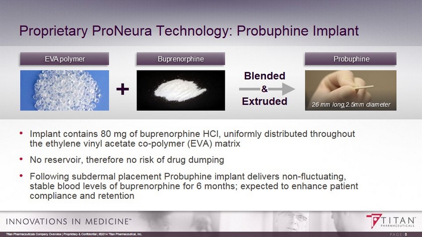 Sources : IMS Health, Wolters Kluwer Treatment of Opioid Dependence: Expanding the Market • Daily buprenorphine dominates the current market ▫ U.S. sales of daily oral formulations of buprenorphine estimated at $1.5B in 2013 ▫ U.S. buprenorphine prescriptions have exceeded those of methadone since 2006 ▫ M arket growth (units) continues ~ 15% • Challenges with sublingual buprenorphine ▫ Compliance ▫ Sublingual dosing results in variable levels of medication in blood ▫ Diversion and abuse associated with current daily dosed formulations 0 200 400 600 800 1000 1200 1400 1600 2008 2009 2010 2011 2012 Suboxone Brand Gross Sales Titan Pharmaceuticals Company Overview | Proprietary & Confidential | ©2014 Titan Pharmaceutical, Inc. 7