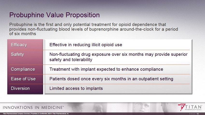 Probuphine Regulatory Timeline • PRO - 814 study completion: Q2, 2015 • Probuphine NDA resubmission: H2, 2015 • FDA Review completion expected within six months 11 Titan Pharmaceuticals Company Overview | Proprietary & Confidential | ©2014 Titan Pharmaceutical, Inc.