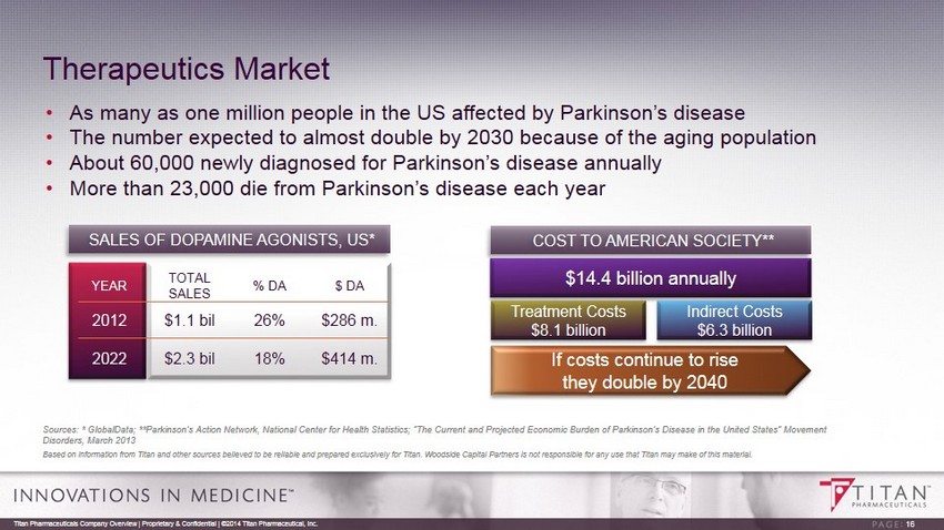 Definition Characterized by the loss of dopaminergic neurons which alters activity in the brain region impacting movement and motor function Treatment Treated with drugs designed to replace or mimic dopamine in the brain Following several years of chronic treatment, these drugs lose their benefit and trigger serious side effects in up to 80% of patients Research Pulsatile dopaminergic stimulation from current oral treatment may cause motor side effects Continuous dopaminergic stimulation (CDS) by subcutaneous infusion of dopamine agonists has been shown to palliate these motor complications and also delay or prevent the onset of dyskinesias Product Opportunity Titan’s ProNeura drug delivery technology has the potential to deliver continuous non - fluctuating levels of dopamine agonists and provide CDS for six months or longer from a single treatment Parkinson’s Disease Overview . Titan Pharmaceuticals Company Overview | Proprietary & Confidential | ©2014 Titan Pharmaceutical, Inc. 14