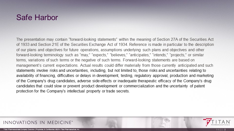 Safe Harbor The presentation may contain “forward - looking statements” within the meaning of Section 27A of the Securities Act of 1933 and Section 21E of the Securities Exchange Act of 1934. Reference is made in particular to the description of our plans and objectives for future operations, assumptions underlying such plans and objectives and other forward - looking terminology such as “may,” “expects,” “believes,” “anticipates,” “intends,” “projects,” or similar terms, variations of such terms or the negative of such terms. Forward - looking statements are based on management’s current expectations. Actual results could differ materially from those currently anticipated and such statements involve risks and uncertainties, including, but not limited to, those risks and uncertainties relating to availability of financing, difficulties or delays in development, testing, regulatory approval, production and marketing of the Company's drug candidates, adverse side effects or inadequate therapeutic efficacy of the Company's drug candidates that could slow or prevent product development or commercialization and the uncertainty of patent protection for the Company's intellectual property or trade secrets. Titan Pharmaceuticals Company Overview | Proprietary & Confidential | ©2014 Titan Pharmaceutical, Inc. 2