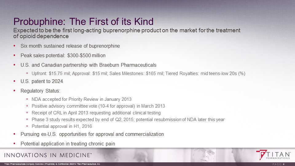 Company Overview Titan Pharmaceuticals specializes in the development of treatments for select chronic diseases utilizing its proprietary ProNeura ™ technology platform • ProNeura : Proprietary Long Term Drug Delivery Platform ▫ Provides non - fluctuating medication levels over periods of six months to a year ▫ Ideal for use in the treatment of chronic diseases for which maintenance of non - fluctuating medication levels may offer advantages over oral administration • Probuphine ® for the Treatment of Opioid Dependence ▫ Long acting formulation of buprenorphine providing six months of steady - state levels ▫ FDA requested Phase 3 clinical study fully enrolled with results expected by end of Q2, 2015 ▫ Resubmission of NDA expected in the second half of 2015 with potential approval in first half of 2016 • ProNeura for Parkinson’s Disease ( r opinirole ) ▫ ProNeura technology is ideal for Parkinson’s Disease ▫ Demonstrated proof of concept in non - clinical study ▫ Conducting IND enabling non - clinical studies with the goal to commence clinical testing in H2, 2016 Titan Pharmaceuticals Company Overview | Proprietary & Confidential | ©2014 Titan Pharmaceutical, Inc. 3