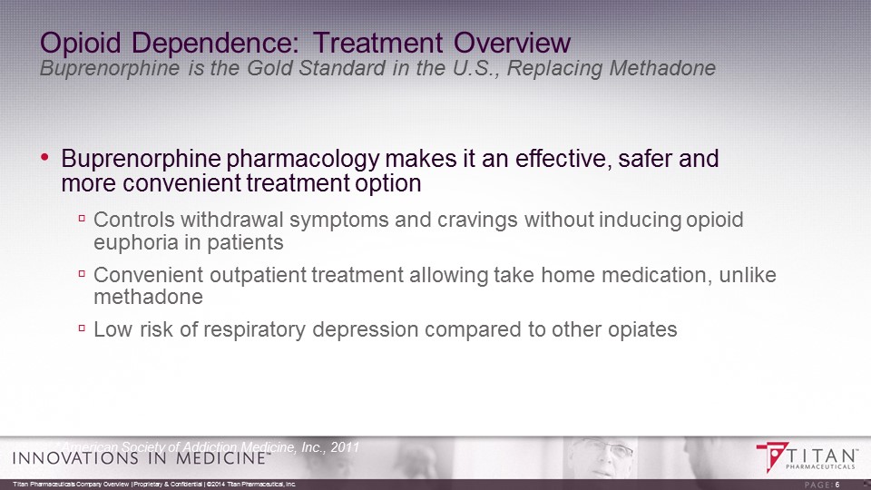 The Epidemic of Opioid Dependence • Increasingly recognized as a global epidemic by world health authorities • Addiction - a primary, chronic disease of brain reward, motivation, memory and neurobiological circuitry ▫ Cravings, accompanied by lack of impulse control ▫ Abstinence is rarely a successful therapeutic approach ▫ Cycles of relapse and remission ▫ Progressive, and often results in disability or premature death if untreated Source: American Society of Addiction Medicine, Inc., 2011 ER Visits Due to Opioid Misuse 0.05 0.10 0.15 0.20 0.25 0.30 0.35 0.40 0.45 2004 2005 2006 2007 2008 2009 MM of Patient Visits 240% increase in 6 years Titan Pharmaceuticals Company Overview | Proprietary & Confidential | ©2014 Titan Pharmaceutical, Inc. 5