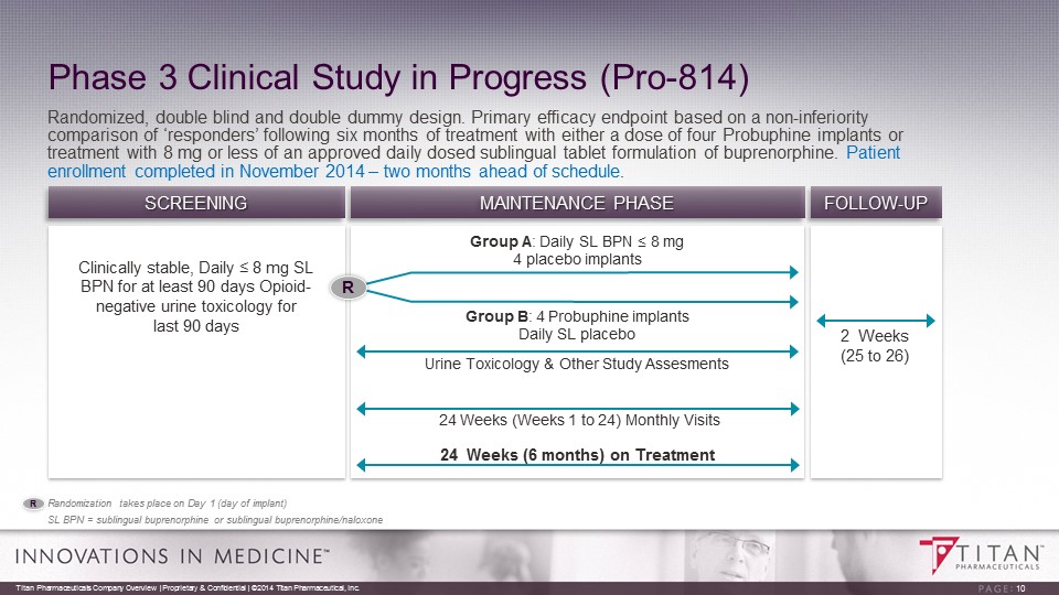 Probuphine Clinical Summary • Six clinical studies completed to date with final Phase 3 study under way ▫ Initial small dose finding study ▫ Two well controlled Phase 3 safety and efficacy studies showing clinical and statistical superiority over placebo and non - inferiority to Suboxone published in Journal of American Medical Association and in the journal Addiction ▫ Two open label long - term treatment safety studies ▫ Relative bioavailability study • Mild to moderate adverse events typical of the safety profile of buprenorphine; low number of serious adverse events similar to placebo • Well tolerated implant procedure • No evidence of implant diversion or misuse Titan Pharmaceuticals Company Overview | Proprietary & Confidential | ©2014 Titan Pharmaceutical, Inc. 9