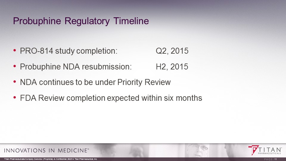 Phase 3 Clinical Study in Progress (Pro - 814) Randomized , double blind and double dummy design. Primary efficacy endpoint based on a non - inferiority comparison of ‘responders’ following six months of treatment with either a dose of four Probuphine implants or treatment with 8 mg or less of an approved daily dosed sublingual tablet formulation of buprenorphine . Patient enrollment completed in November 2014 – two months ahead of schedule . 10 Titan Pharmaceuticals Company Overview | Proprietary & Confidential | ©2014 Titan Pharmaceutical, Inc. R FOLLOW - UP 24 Weeks (Weeks 1 to 24 ) Monthly Visits Group A : Daily SL BPN ≤ 8 mg 4 placebo implants SCREENING Clinically stable, Daily ≤ 8 mg SL BPN for at least 90 days Opioid - negative urine toxicology for last 90 days MAINTENANCE PHASE 2 Weeks (25 to 26) 24 Weeks (6 months) on Treatment Urine Toxicology & Other Study Assesments Group B : 4 Probuphine implants Daily SL placebo Randomization takes place on Day 1 (day of implant ) SL BPN = sublingual buprenorphine or sublingual buprenorphine/naloxone R