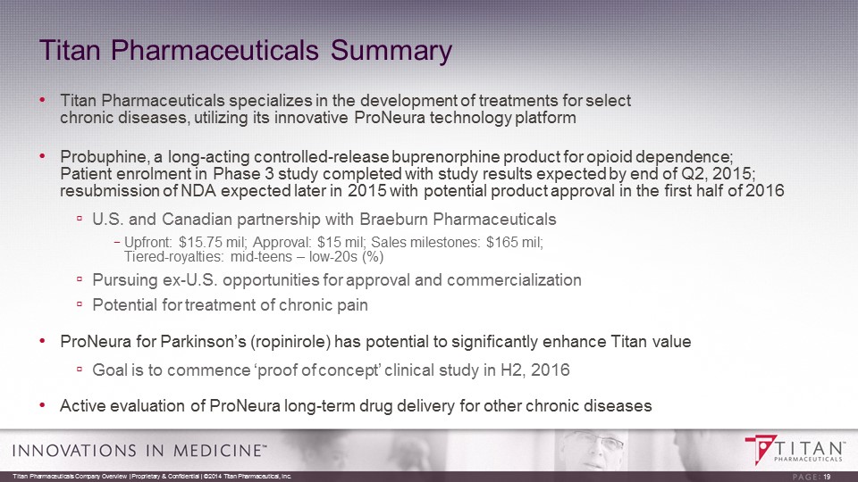 ProNeura Parkinson’s Disease Program Next Steps In consultation with the Scientific Advisory Board: • Optimize implant formulation of ropinirole • Conduct non - clinical studies to support Investigational New Drug (IND) application • Design a proof of concept clinical study • Conduct a pre - IND meeting with the FDA • Complete non - clinical studies to enable timely submission of IND and commence ‘proof of concept’ clinical study in H2, 2016 18 Titan Pharmaceuticals Company Overview | Proprietary & Confidential | ©2014 Titan Pharmaceutical, Inc.