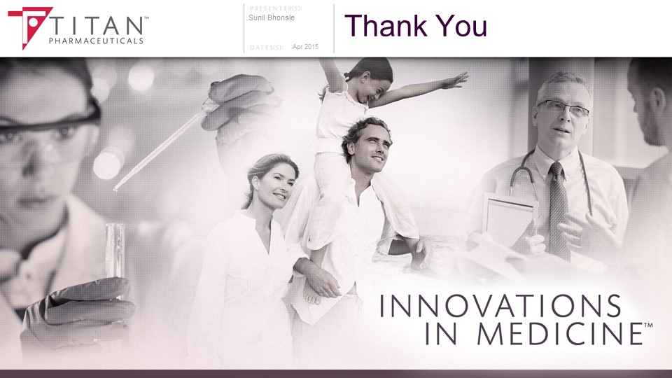 • Marc Rubin, M.D, Executive Chairman and Director ▫ Eight years with Titan Pharmaceuticals. Former Head of Global Research & Development and member of the Board of Management at Bayer Pharma. Executive R&D and commercial responsibilities at GSK for 13 years. Twenty - five years in the pharmaceutical industry following seven years at NIH. • Sunil Bhonsle , M.B.A., President and Director ▫ Nineteen years with Titan Pharmaceuticals. Twenty years with Bayer Corporation in Biological and Pharmaceutical finance and operations management. • Kate Glassman Beebe, Ph.D., Executive Vice President, Chief Development Officer ▫ Eight years with Titan Pharmaceuticals. Nineteen years in pharmaceutical industry, with senior positions in clinical development and medical affairs at GSK and Merck. Ten years in academic medicine. Titan Executive Management