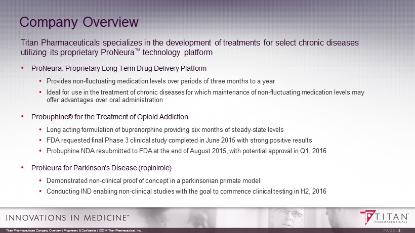 Forward Looking Statements The presentation may contain “forward - looking statements” within the meaning of Section 27A of the Securities Act of 1933 and Section 21E of the Securities Exchange Act of 1934. Reference is made in particular to the description of our plans and objectives for future operations, assumptions underlying such plans and objectives and other forward - looking terminology such as “may,” “expects,” “believes,” “anticipates,” “intends,” “projects,” or similar terms, variations of such terms or the negative of such terms. Forward - looking statements are based on management’s current expectations. Actual results could differ materially from those currently anticipated and such statements involve risks and uncertainties, including, but not limited to, those risks and uncertainties relating to availability of financing, difficulties or delays in development, testing, regulatory approval, production and marketing of the Company's drug candidates, adverse side effects or inadequate therapeutic efficacy of the Company's drug candidates that could slow or prevent product development or commercialization and the uncertainty of patent protection for the Company's intellectual property or trade secrets. Titan Pharmaceuticals Company Overview | Proprietary & Confidential | ©2014 Titan Pharmaceutical, Inc. 2