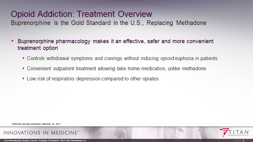 The Epidemic of Opioid Addiction • Increasingly recognized as a global epidemic by world health authorities • Addiction - a primary, chronic disease of brain reward, motivation, memory and neurobiological circuitry • Cravings, accompanied by lack of impulse control • Abstinence is rarely a successful therapeutic approach • Cycles of relapse and remission • Progressive, and often results in disability or premature death if untreated Source: American Society of Addiction Medicine, Inc., 2011 ER Visits Due to Opioid Misuse 0.05 0.10 0.15 0.20 0.25 0.30 0.35 0.40 0.45 2004 2005 2006 2007 2008 2009 MM of Patient Visits 240% increase in 6 years Titan Pharmaceuticals Company Overview | Proprietary & Confidential | ©2014 Titan Pharmaceutical, Inc. 4