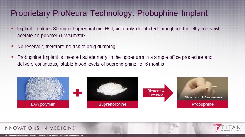 Sources : IMS Health, Wolters Kluwer Treatment of Opioid Addiction: Expanding the Market • Buprenorphine is the gold standard in the U.S ., replacing methadone • U.S. sales of daily oral formulations approximately $1.7B in 2014 • U.S. prescriptions have exceeded methadone since 2006 • M arket growth (units) continues ~ 9% • Challenges with sublingual buprenorphine • Compliance • Dosing results in variable levels of medication in blood • Diversion and abuse associated with current daily dosed formulations Titan Pharmaceuticals Company Overview | Proprietary & Confidential | ©2014 Titan Pharmaceutical, Inc. 6 0 200 400 600 800 1000 1200 1400 1600 2008 2009 2010 2011 2012 Suboxone Brand Gross Sales