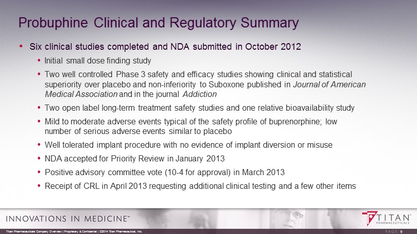 Probuphine Value Proposition Probuphine is the first and only potential treatment for opioid dependence that provides non - fluctuating blood levels of buprenorphine around - the - clock for a period of six months 8 Titan Pharmaceuticals Company Overview | Proprietary & Confidential | ©2014 Titan Pharmaceutical, Inc. Efficacy Effective in reducing illicit opioid use Safety Non - fluctuating drug exposure over six months may provide superior safety and tolerability Compliance Treatment with implant expected to enhance compliance Ease of Use Patients dosed once every six months in an outpatient setting Diversion Limited access to implants